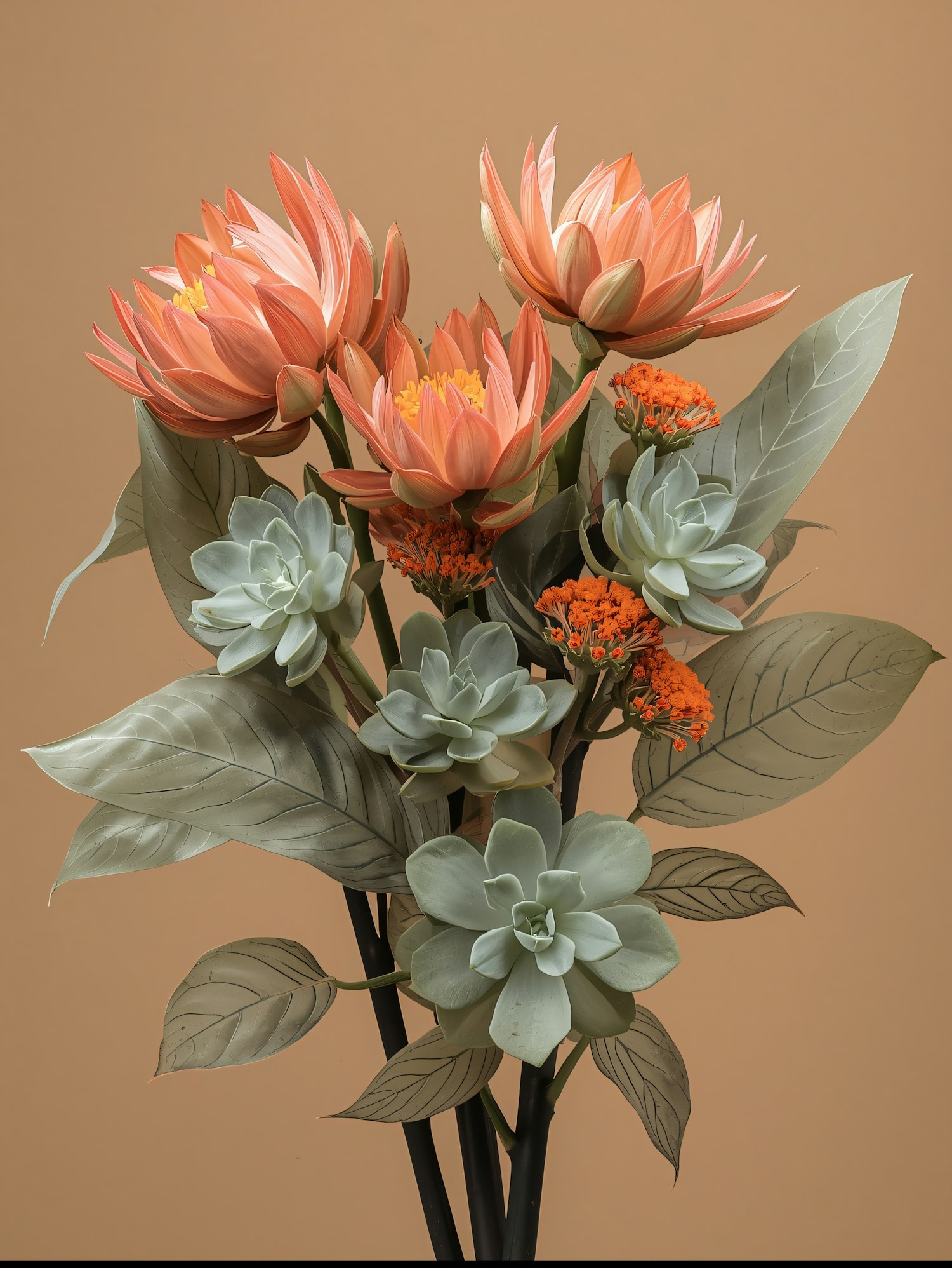 A stunning floral arrangement with orange lotus flowers, green succulents, and detailed leaves against a soft beige background.