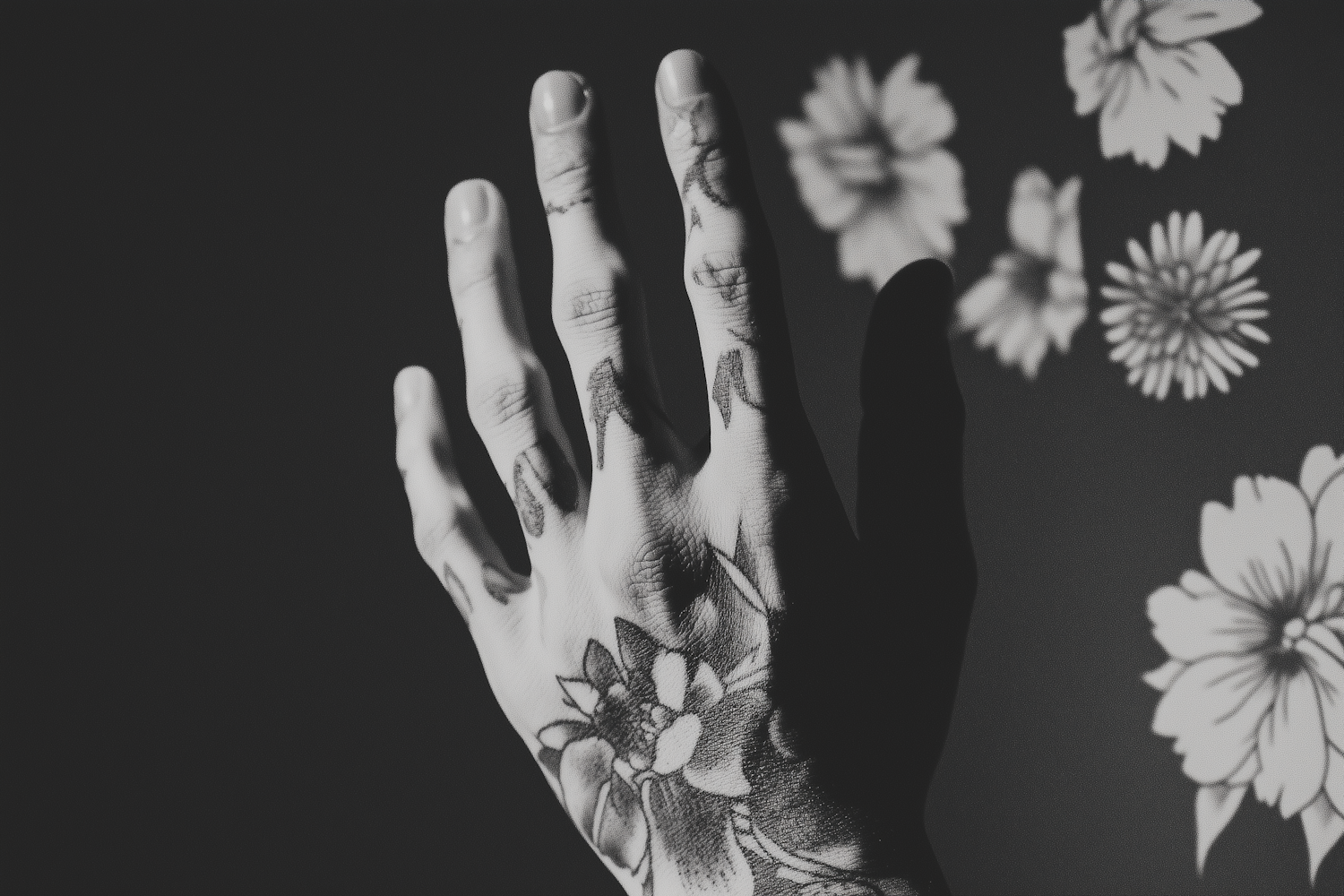 Black-and-white image of a tattooed hand with floral designs, casting shadows on a dark background with blurred flower patterns.