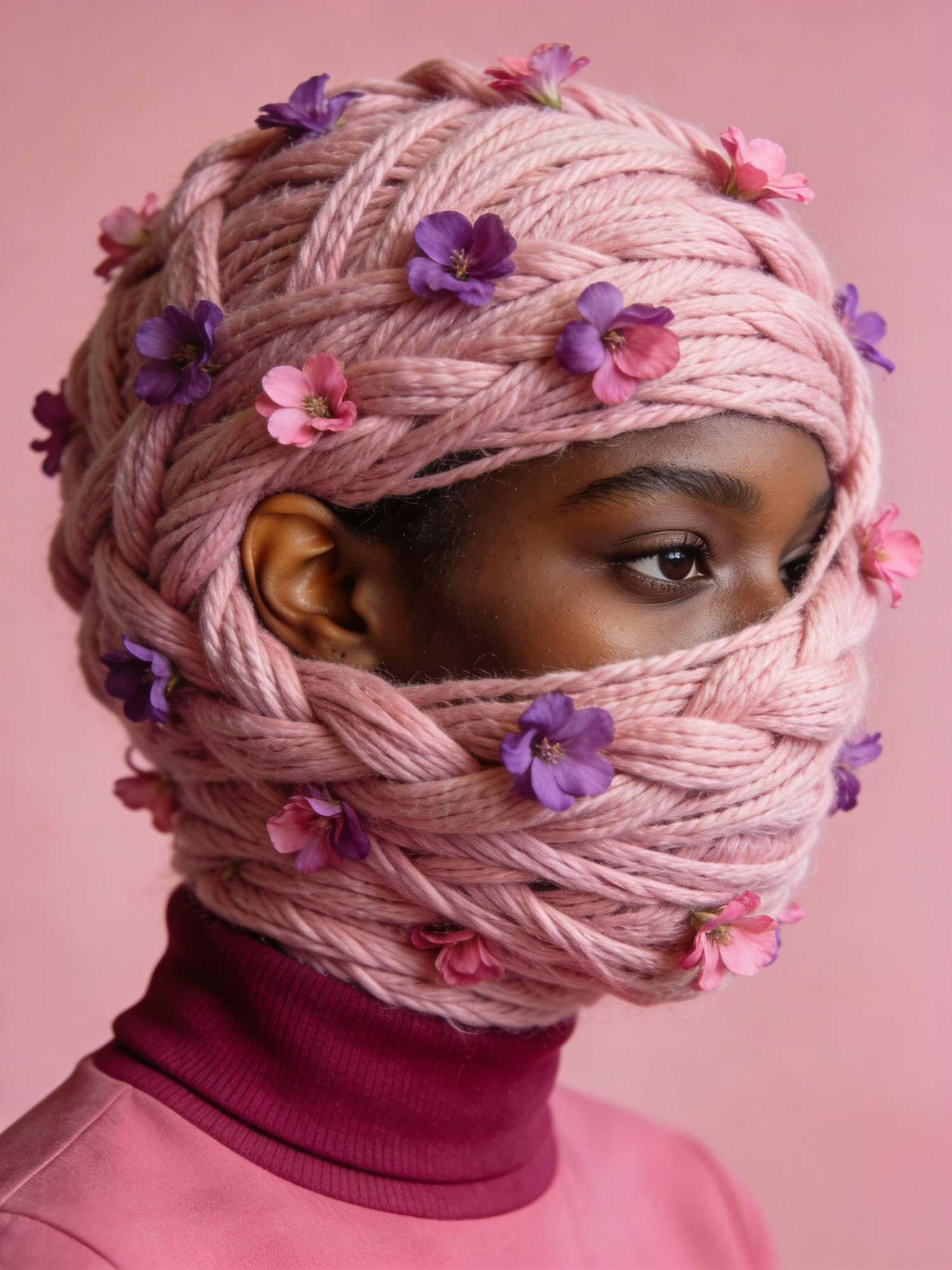 A Black woman’s head is fully wrapped in thick, sculptural pink yarn, with small purple-pink flowers delicately interspersed throughout the layers. Her ear is partially visible, hinting at the human presence beneath the cocoon-like textile. She wears a pink turtleneck that contrasts sharply with the soft pink tones, grounding the composition in quiet strength. The background is a solid pink hue that matches the yarn, creating a monochromatic field of warmth and concealment. The lighting is soft and even, emphasizing the yarn’s texture, the floral accents, and the gentle contours of her skin. The mood is tender and surreal, blending themes of transformation, identity, and emotional softness. Hyperrealistic rendering should focus on yarn layering, floral placement, skin detail, and tonal harmony across the garment, accessory, and background.