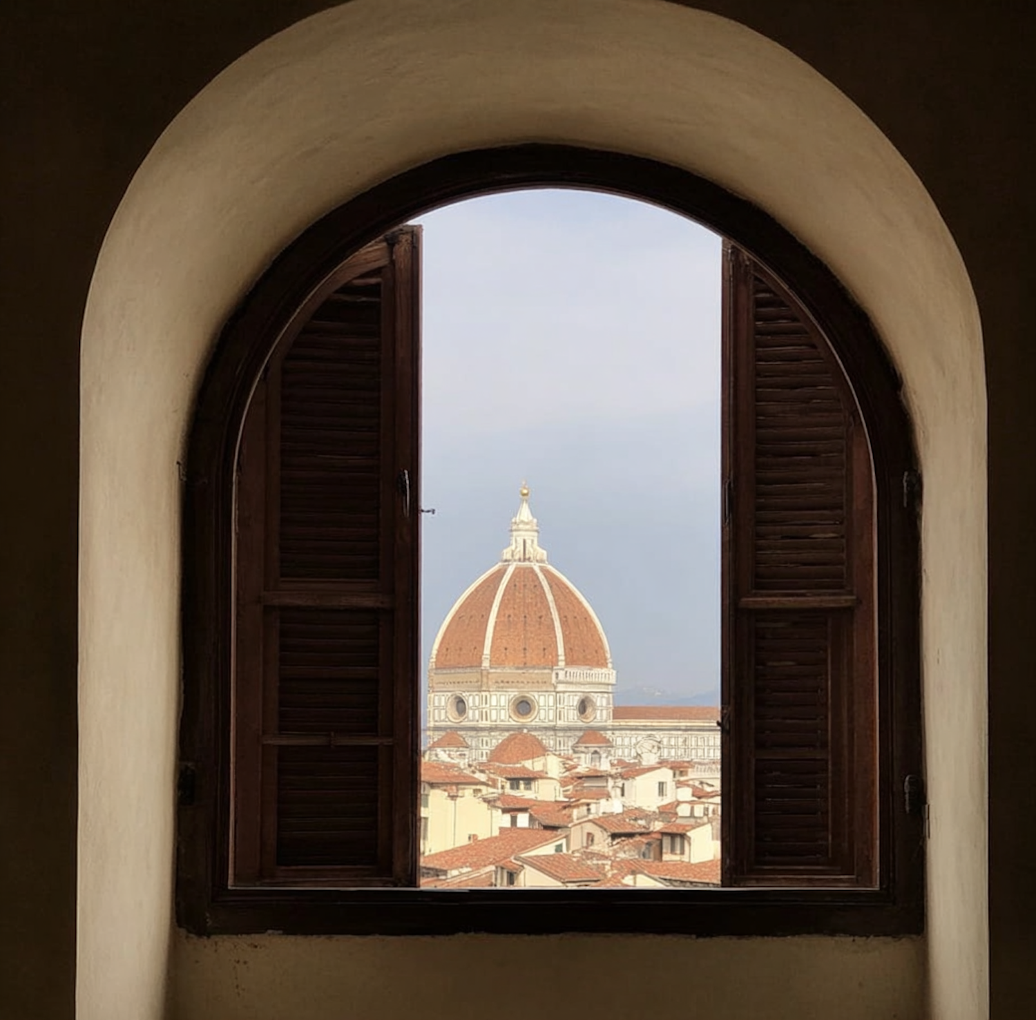 A stunning view of Florence's iconic cathedral dome framed by a rustic arched window with wooden shutters.