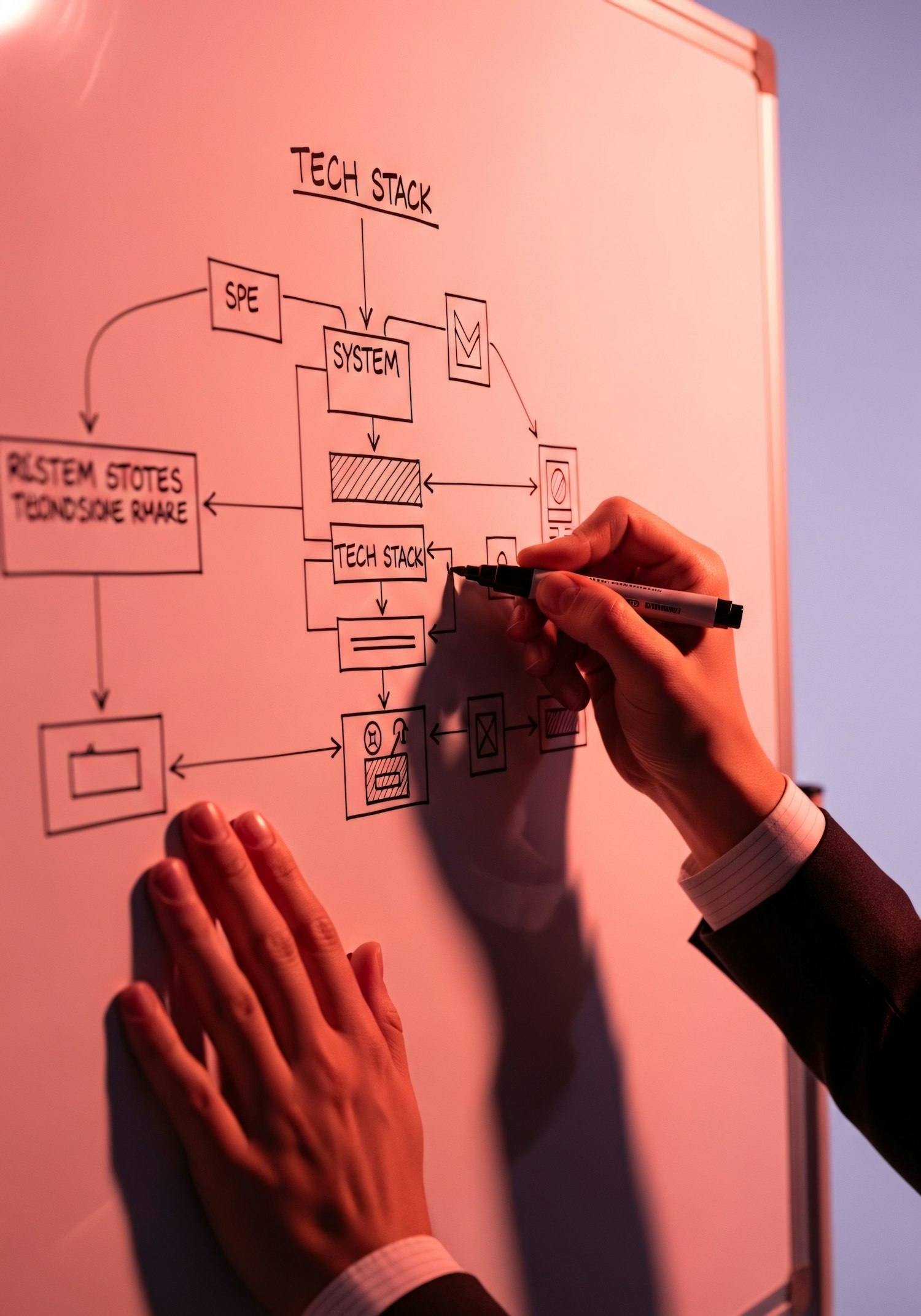 A person draws a detailed tech stack flowchart on a whiteboard under warm lighting, showcasing system architecture and design.