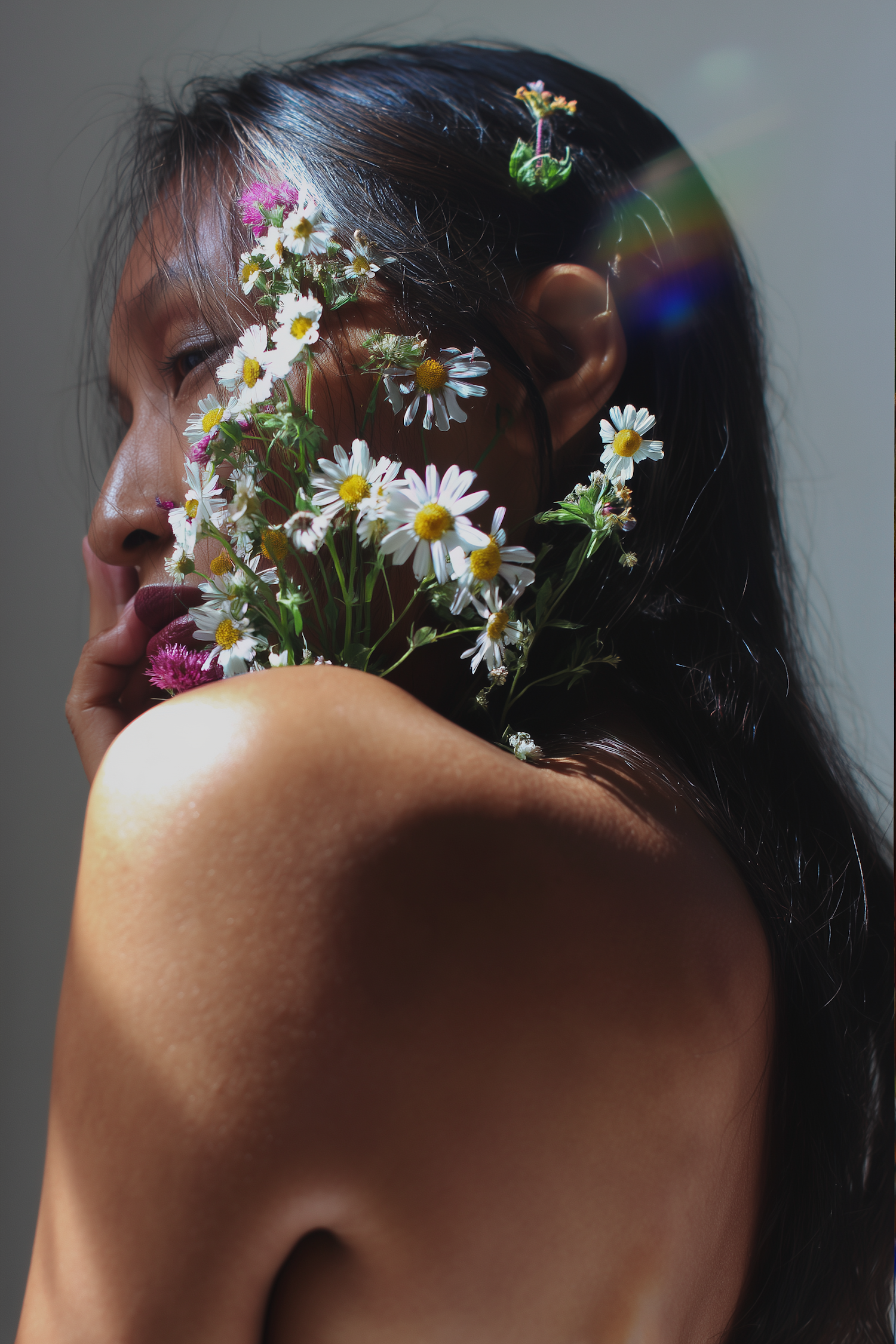 A person adorned with daisies and flowers in an artistic close-up, with soft lighting and a rainbow effect creating a captivating composition.
