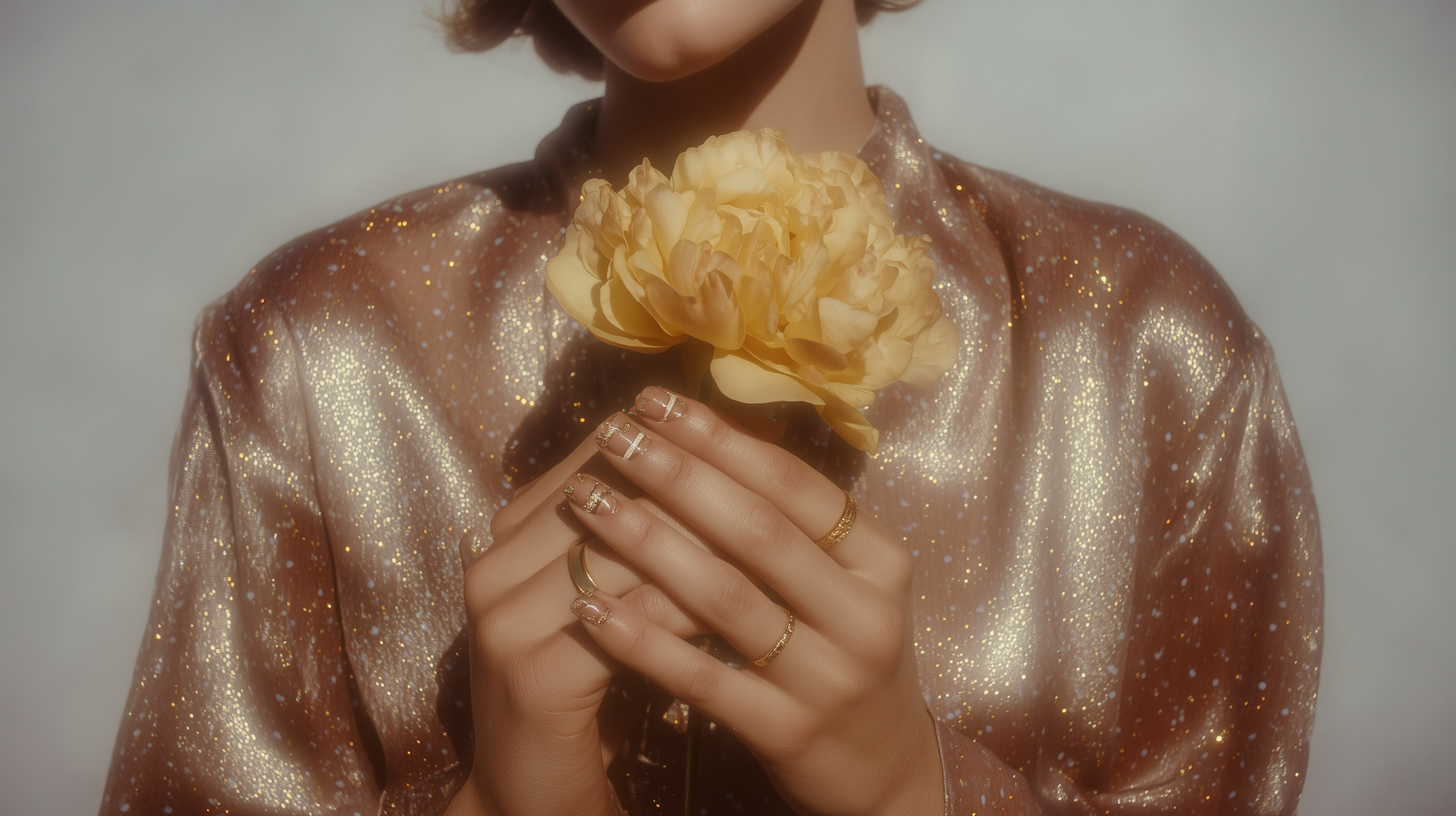 A close-up of hands holding a yellow flower, with gold rings and glittery nail art, set against a shimmering blouse in soft lighting.