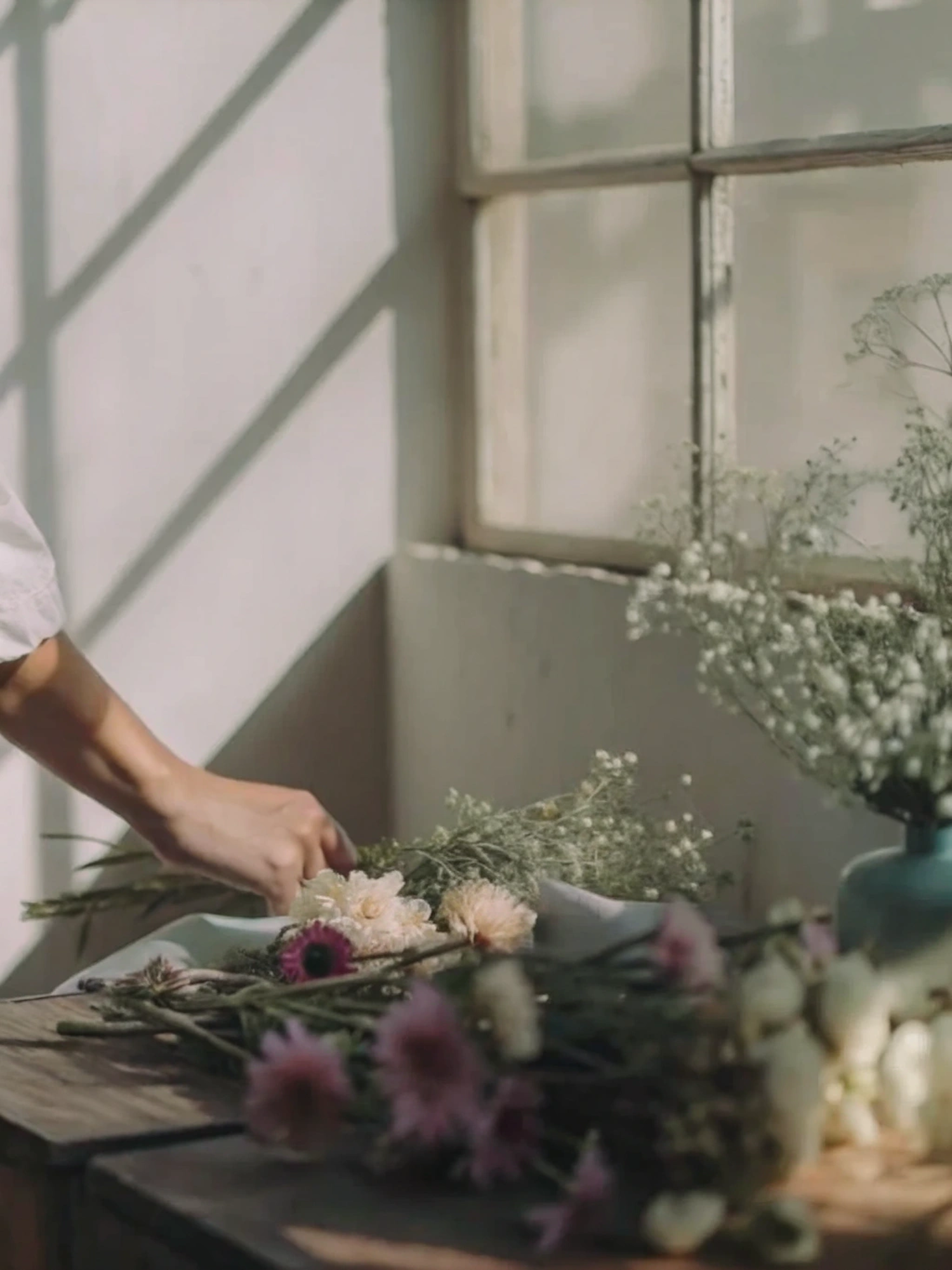 A calm scene of flower arranging on a wooden table with soft sunlight, featuring pink, white, and purple blooms and a vintage-style window.