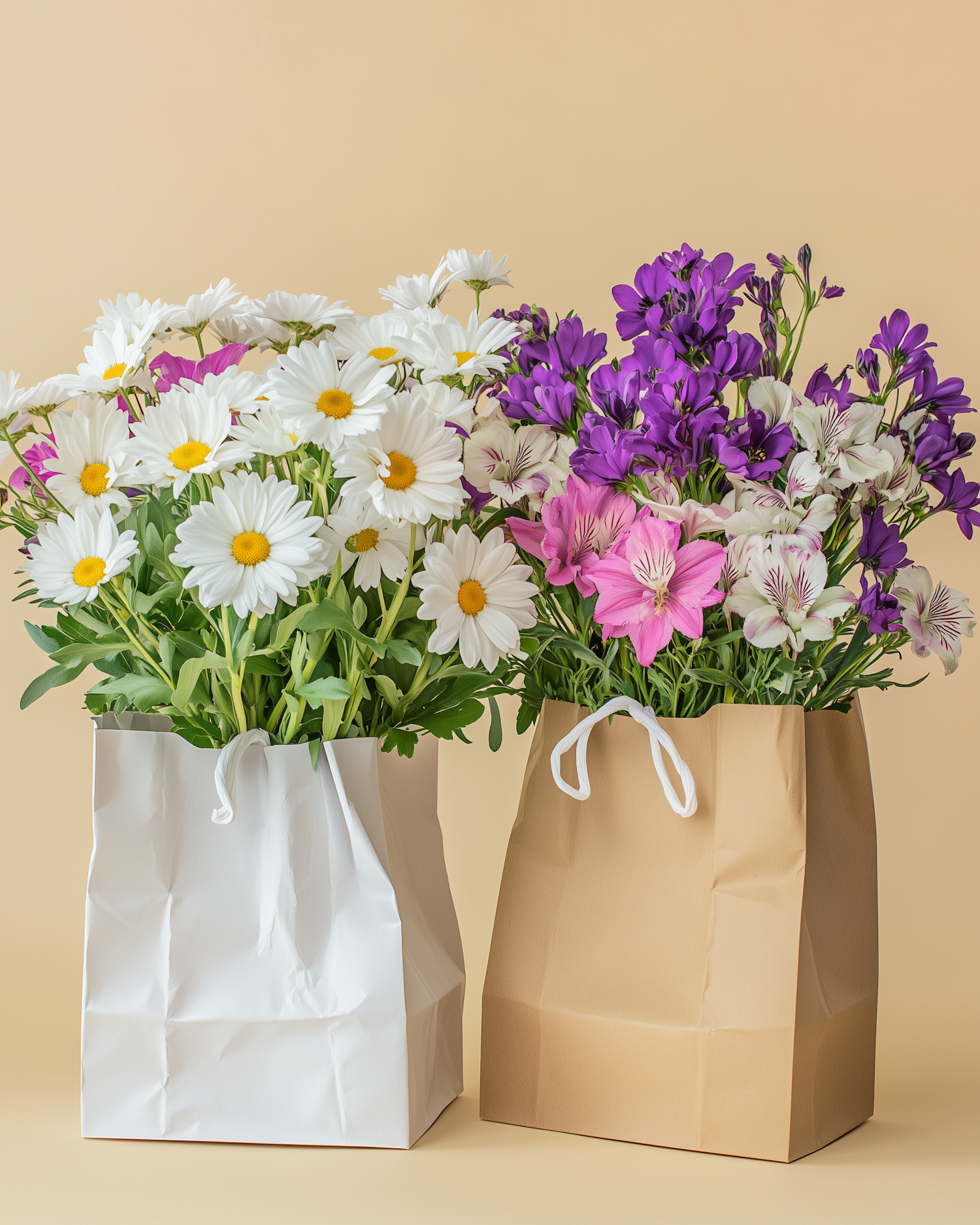 Two paper bags filled with fresh daisies, purple, and pink flowers against a beige background. Perfect for a cheerful floral arrangement.