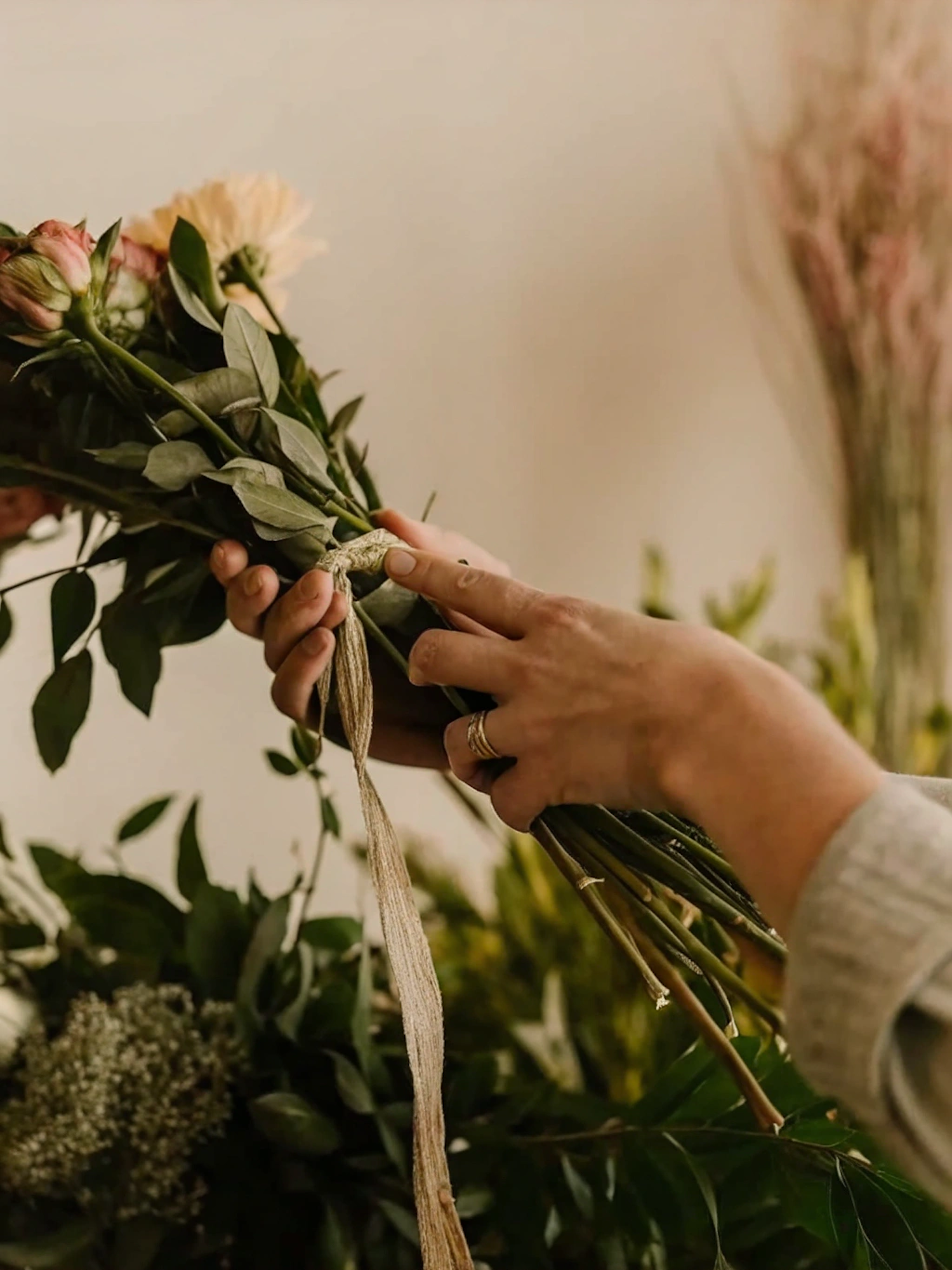 Close-up of hands tying a ribbon around a flower bouquet with pink and yellow blooms, set against a soft, neutral background.