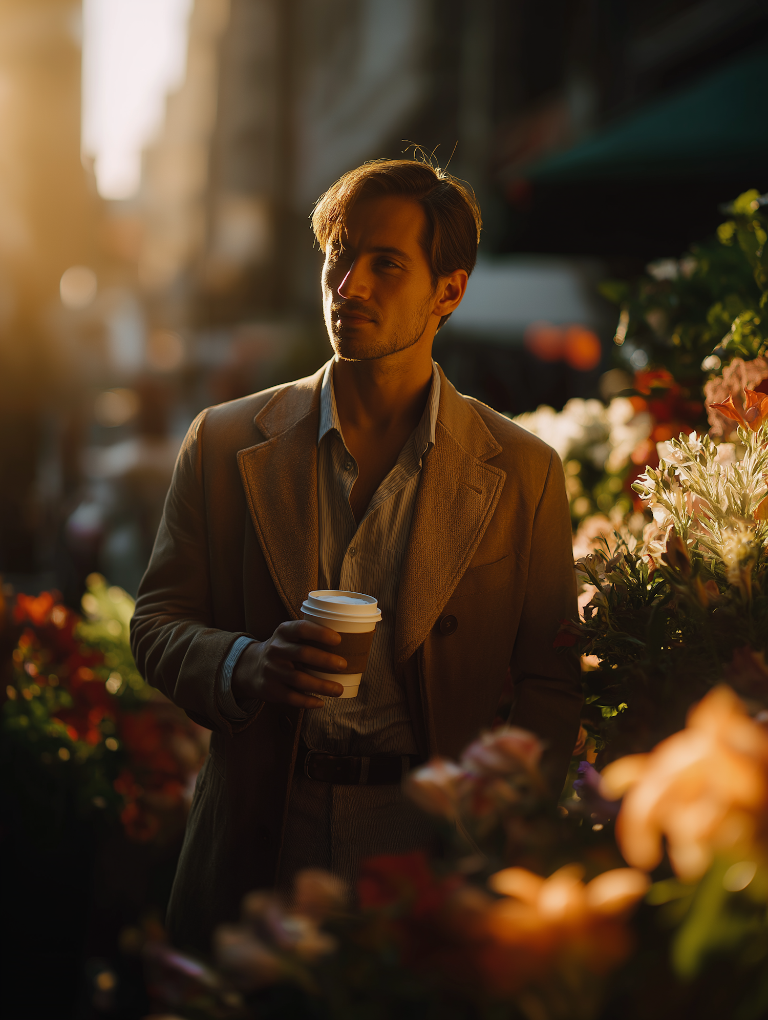 A man in a beige coat holding coffee stands in a sunlit flower market, surrounded by vibrant blooms and a warm, golden atmosphere.