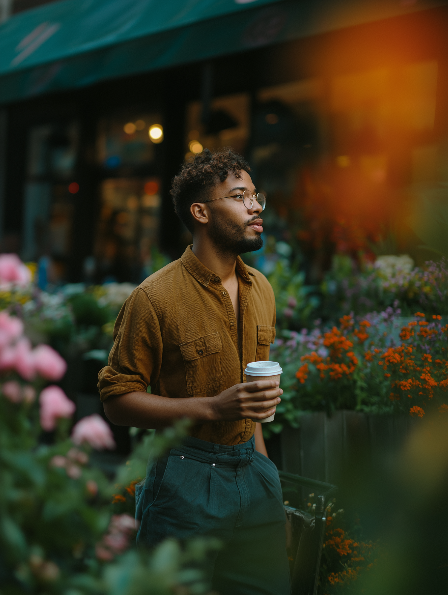 A stylish man in a mustard shirt and glasses enjoys coffee at a vibrant flower market, surrounded by colorful blooms and soft light.