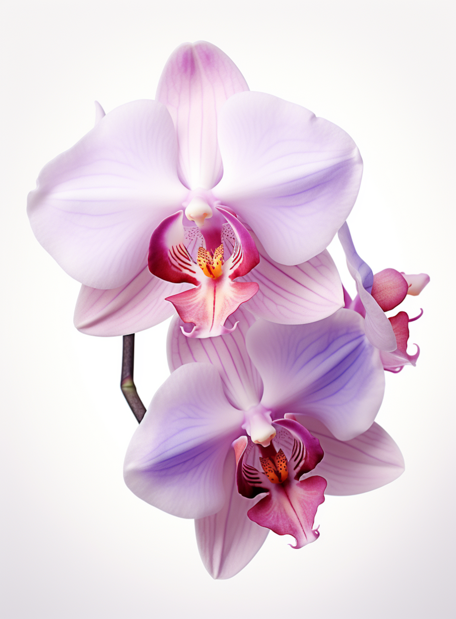 Close-up of elegant orchids with soft purple petals and vibrant centers, set against a simple white background.