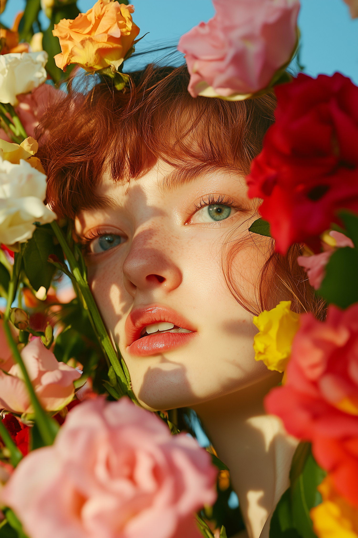 Close-up of a freckled woman with auburn hair surrounded by colorful flowers under warm sunlight and a clear blue sky.