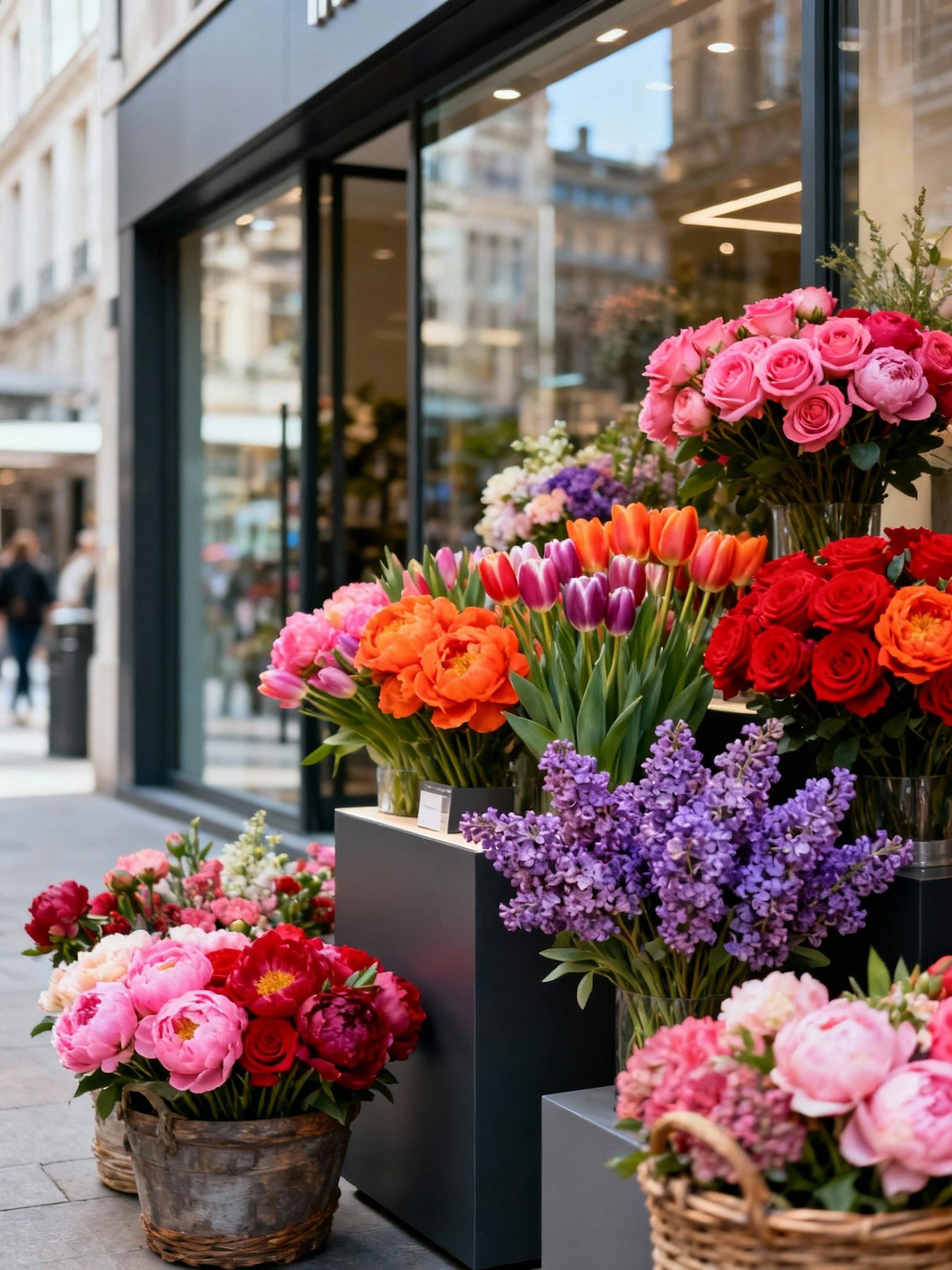 A vibrant flower shop display with colorful blooms including peonies, tulips, and roses, set against a modern urban backdrop.