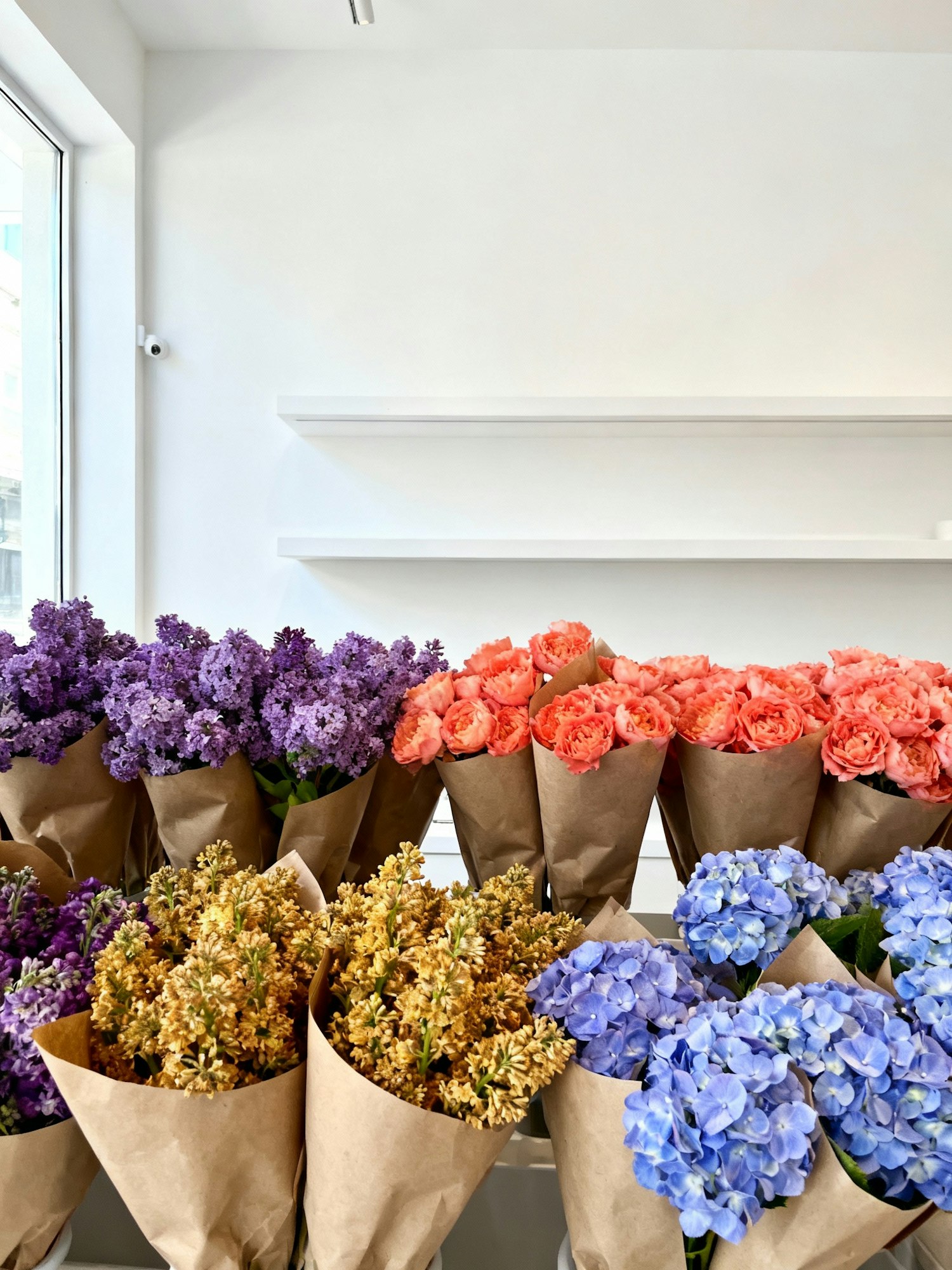 Vibrant bold aesthetic photograph, natural lifestyle style, soft daylight, candid framing, rich textures, colorful flower bouquets, not staged, influencer style photography, high quality realistic details — Inside a modern flower boutique, clean walls, minimal shelves with rows of colorful bouquets in kraft paper, vibrant tones of lavender, honey, coral and periwinkle, bright and fresh atmosphere, aesthetic and contemporary design