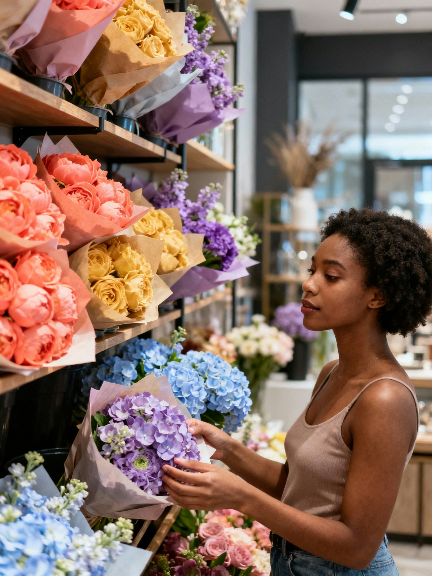 Vibrant bold aesthetic photograph, natural lifestyle style, soft daylight, candid framing, rich textures, colorful flower bouquets, not staged, influencer style photography, high quality realistic details — Inside a modern flower boutique, shelves filled from top to bottom with colorful bouquets in pastel wrapping, tones of coral, honey, lavender and periwinkle, a young woman casually dressed browsing and picking a bouquet, candid natural moment, aesthetic lifestyle atmosphere