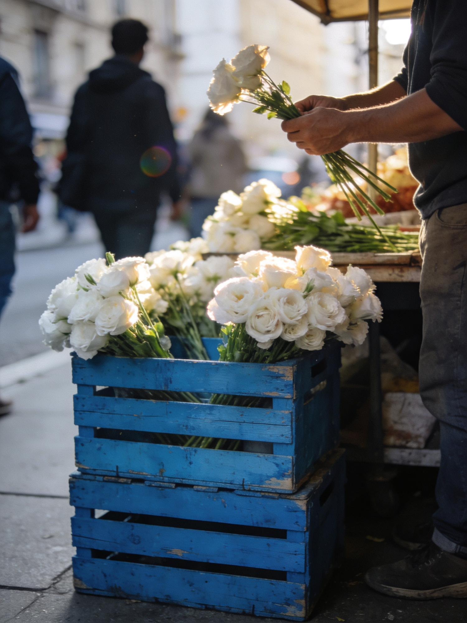 A vendor arranges white flowers in blue crates on a busy street, with soft light highlighting the blooms and creating a warm atmosphere.