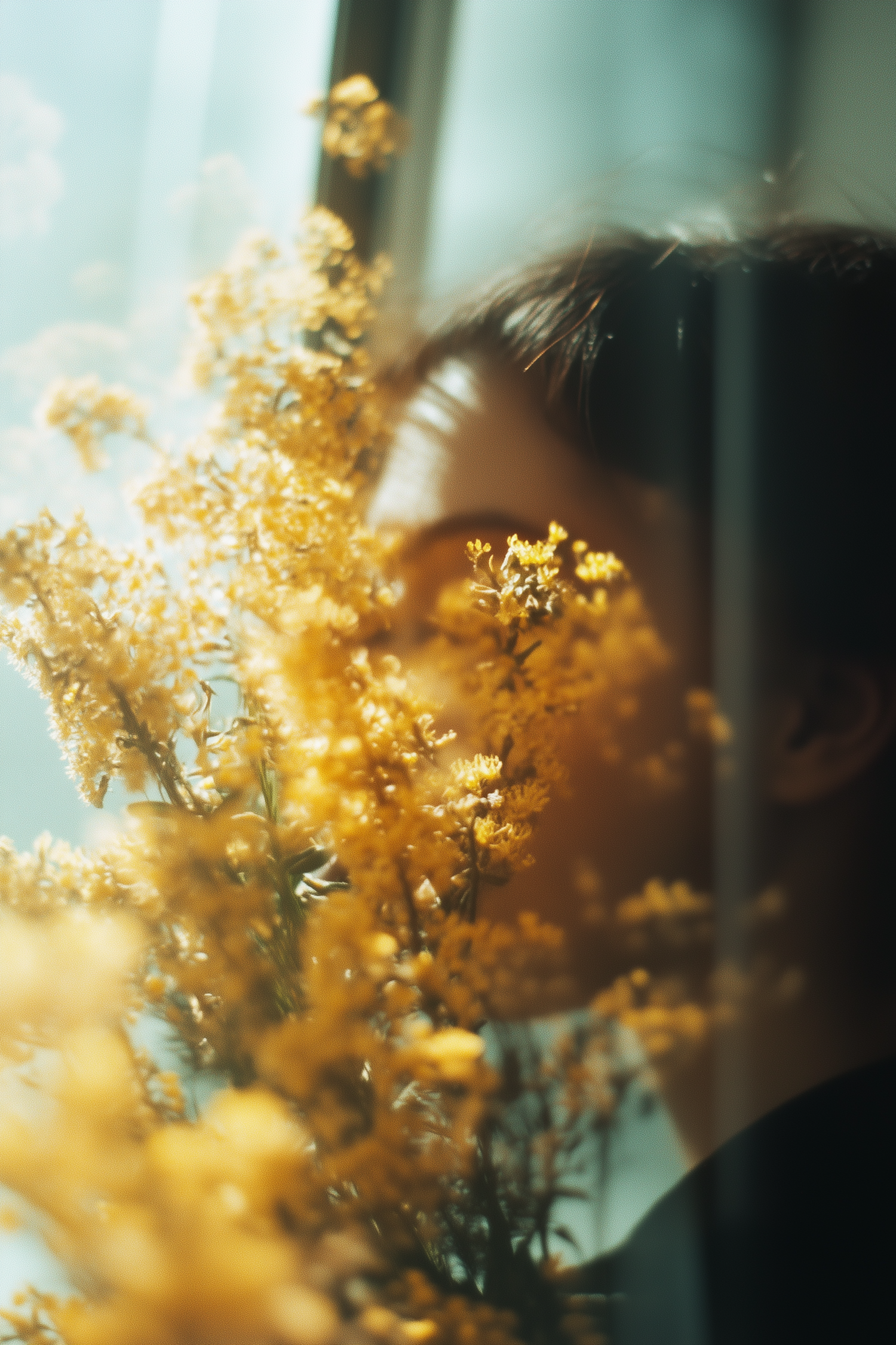 Dreamy portrait of a person behind vibrant yellow flowers, bathed in soft natural light near a window. Ethereal and intimate vibe.