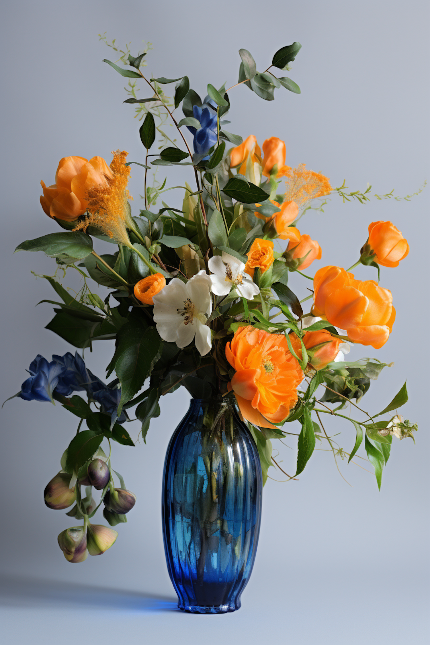 Elegant floral arrangement with orange, white, and blue flowers in a tall blue vase against a soft background.