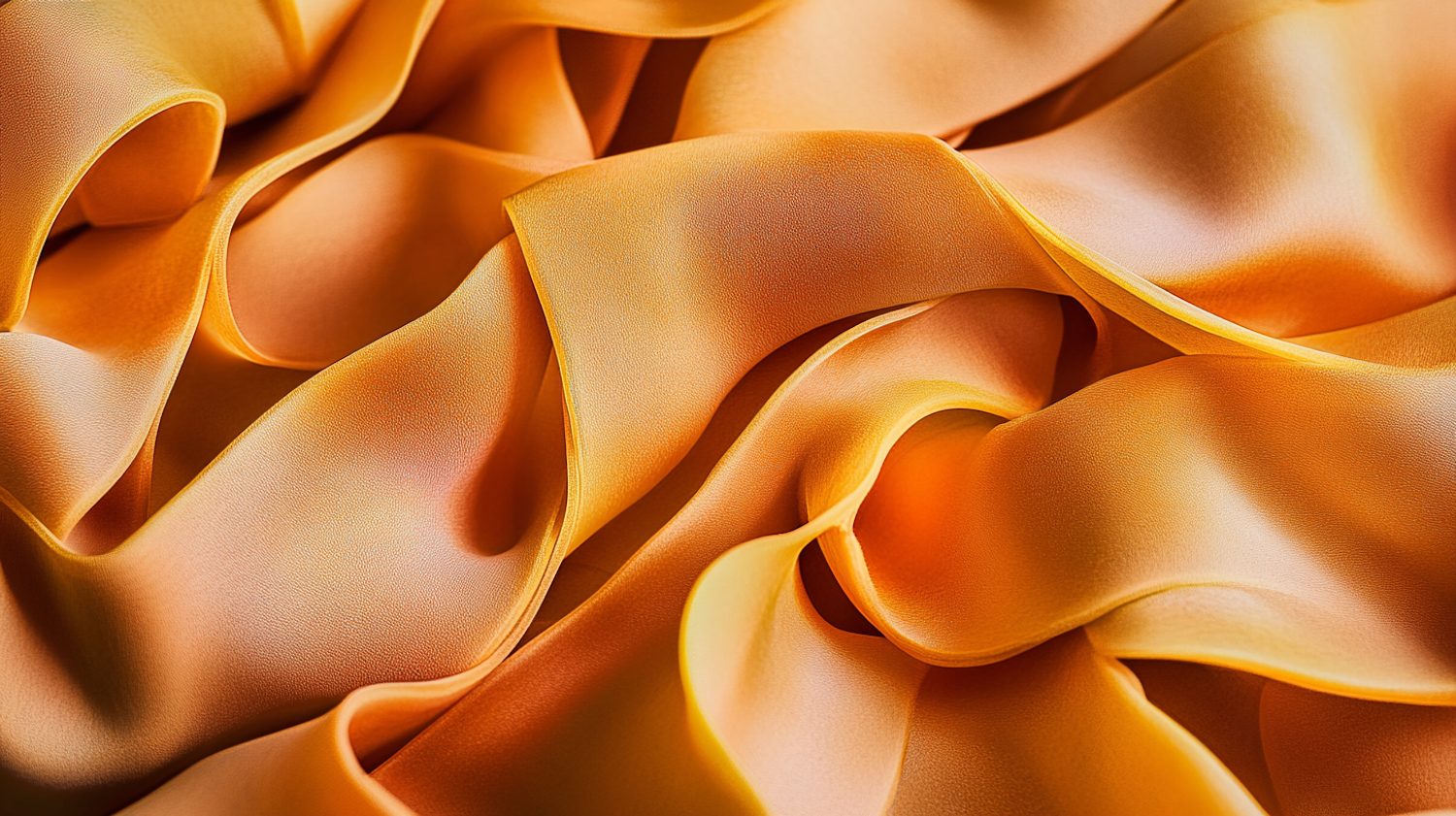 Vibrant orange and yellow silky fabric with flowing waves and smooth texture, creating a sense of movement and luxury.