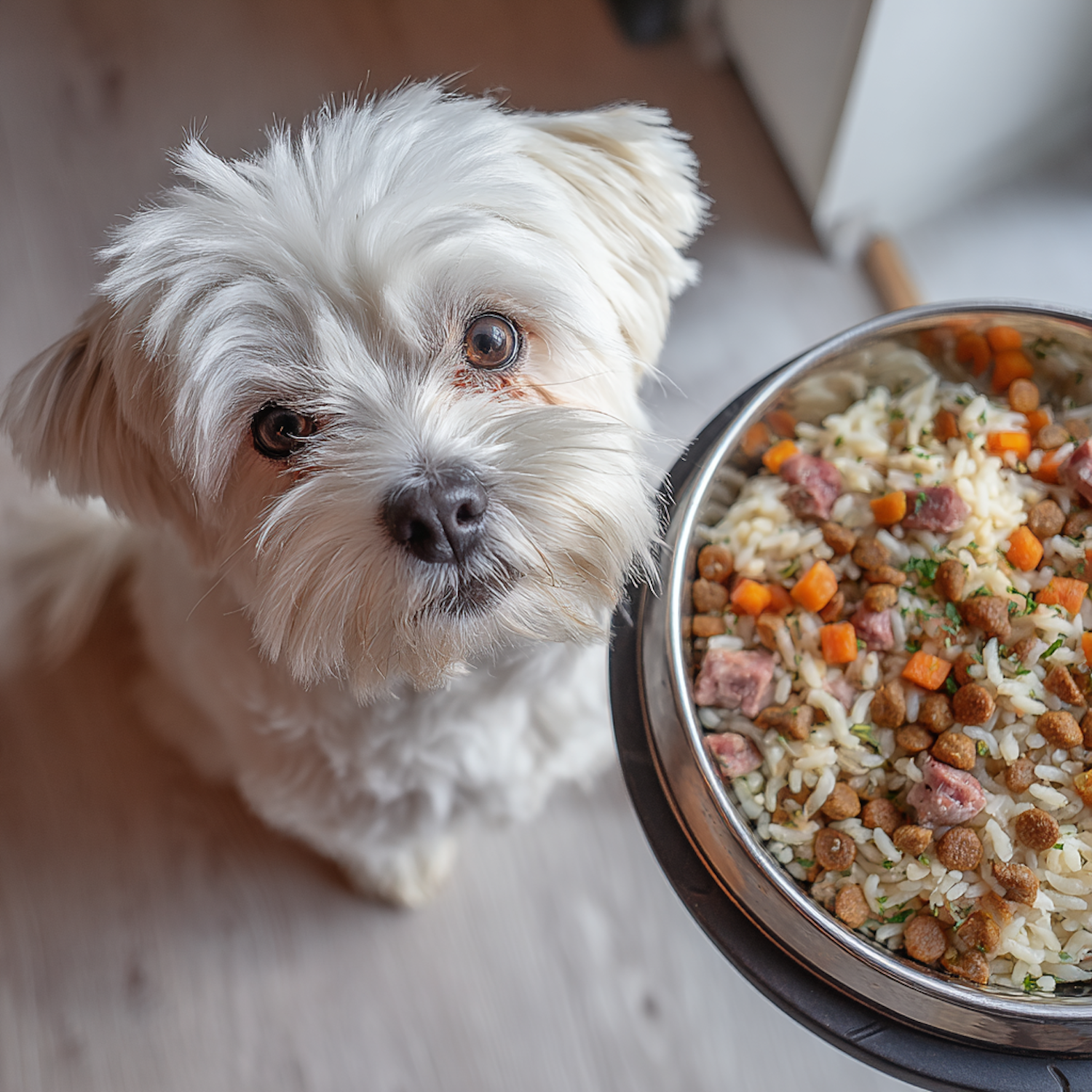 A fluffy white dog gazes up beside a bowl of mixed food with rice, carrots, and kibble, creating a heartwarming and appetizing scene.