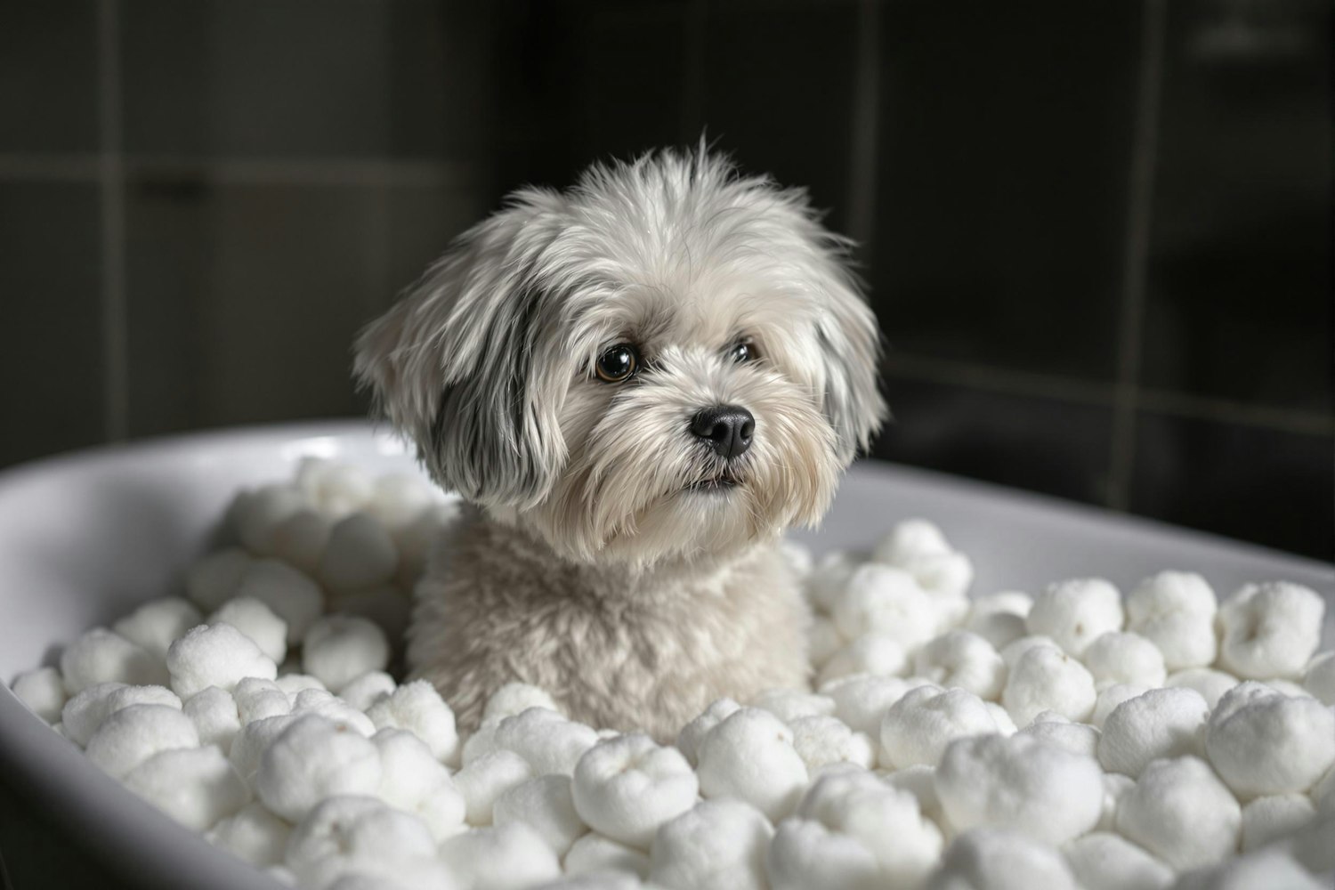 perro maltes blanco y gris aterciopelado de peluche hiperrealista con alto contraste e iluminación en bañera de algodón