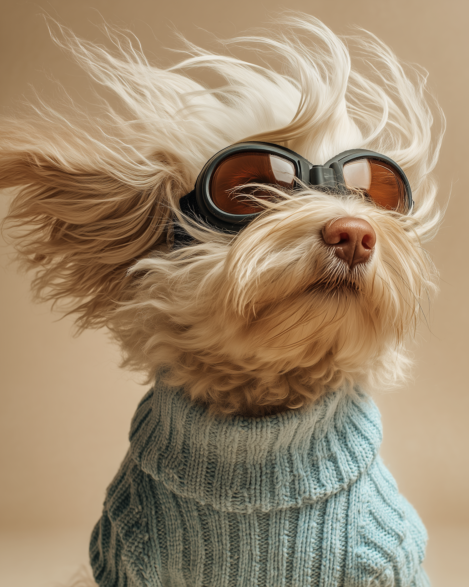 Adorable fluffy dog in a blue sweater and goggles, with windswept fur against a beige background. Perfect mix of cute and quirky!