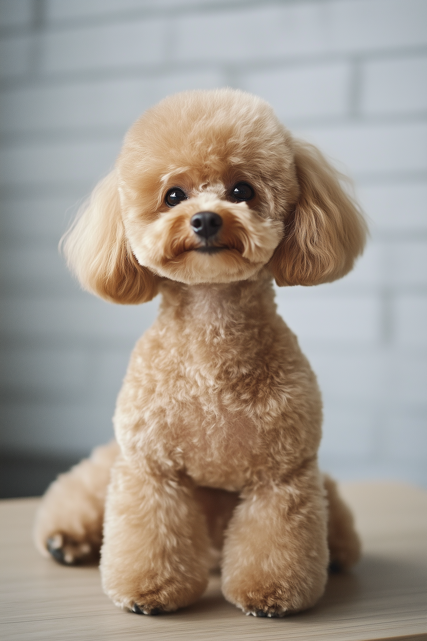 Adorable fluffy dog with light brown curly fur and expressive eyes, sitting on a wooden surface against a gray brick wall.