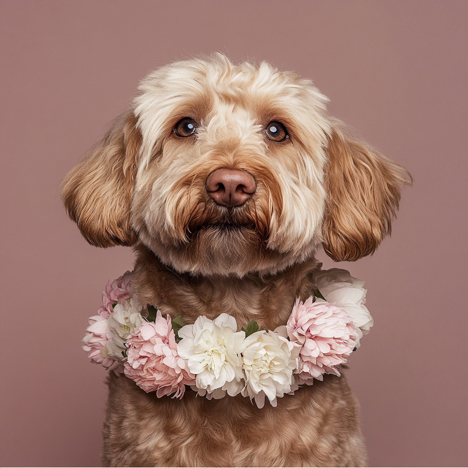 Adorable Labradoodle with wavy fur and a floral garland of pink and white flowers, set against a soft pink background.