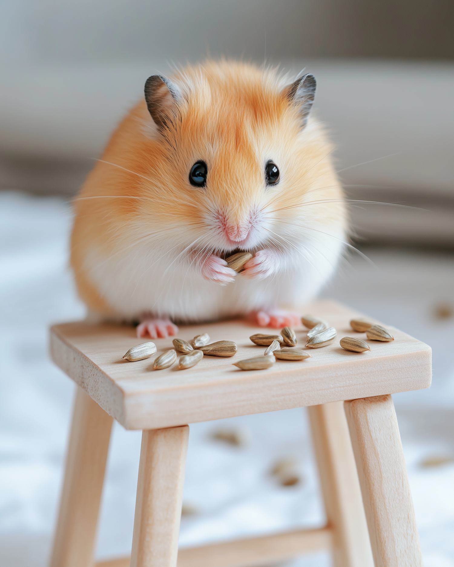 Adorable golden-brown hamster munching on sunflower seeds atop a wooden stool, with a soft blurred background.