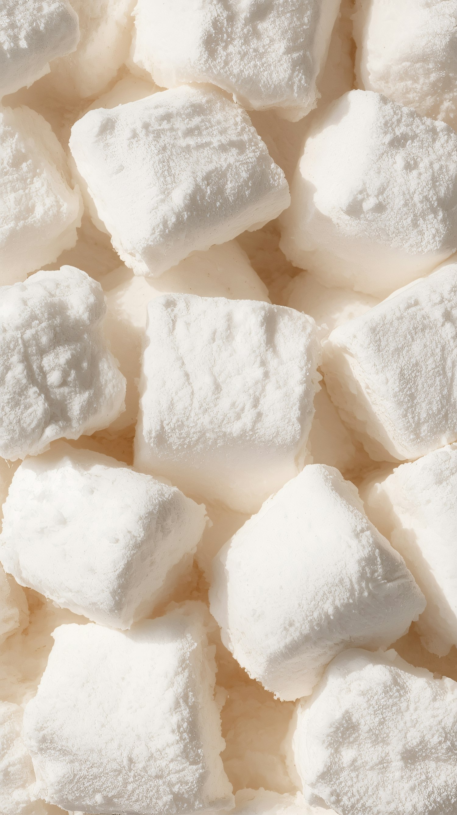 Close-up of fluffy white marshmallows with a powdery texture, arranged randomly, showcasing their soft and spongy appearance.