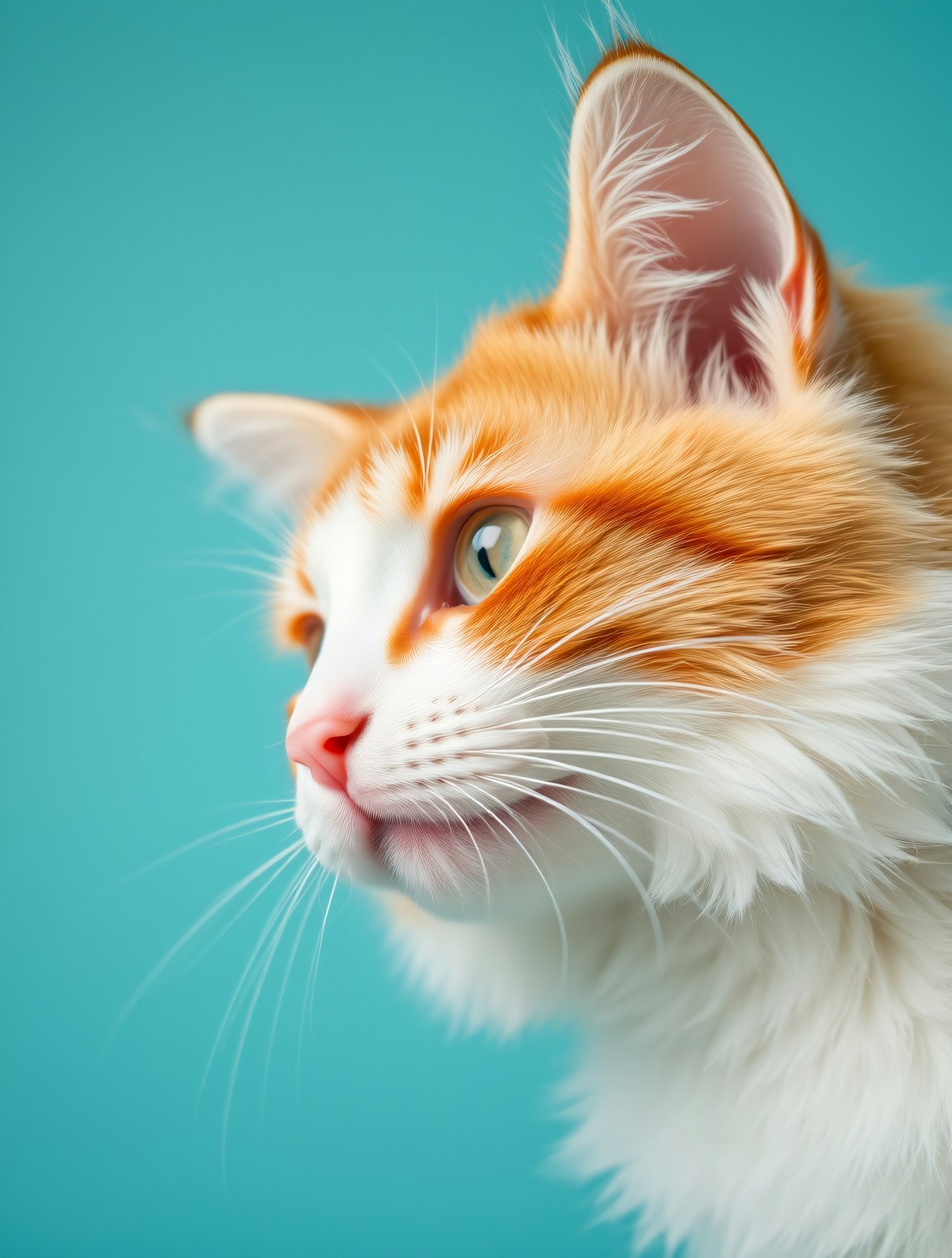 Close-up of a fluffy orange and white cat with green eyes, gazing sideways against a vibrant teal background. Perfect for cat lovers!