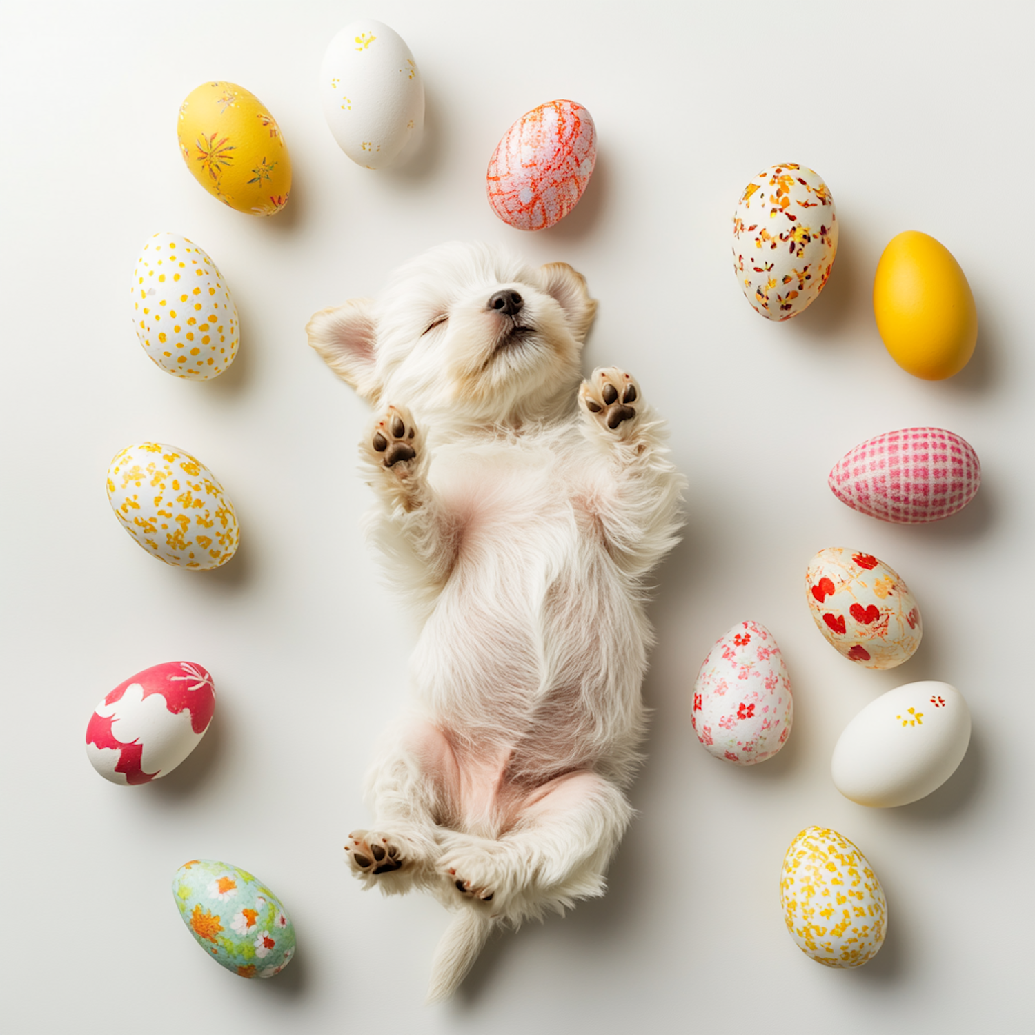 Adorable white puppy napping on its back, surrounded by colorful, patterned Easter eggs on a clean white background.