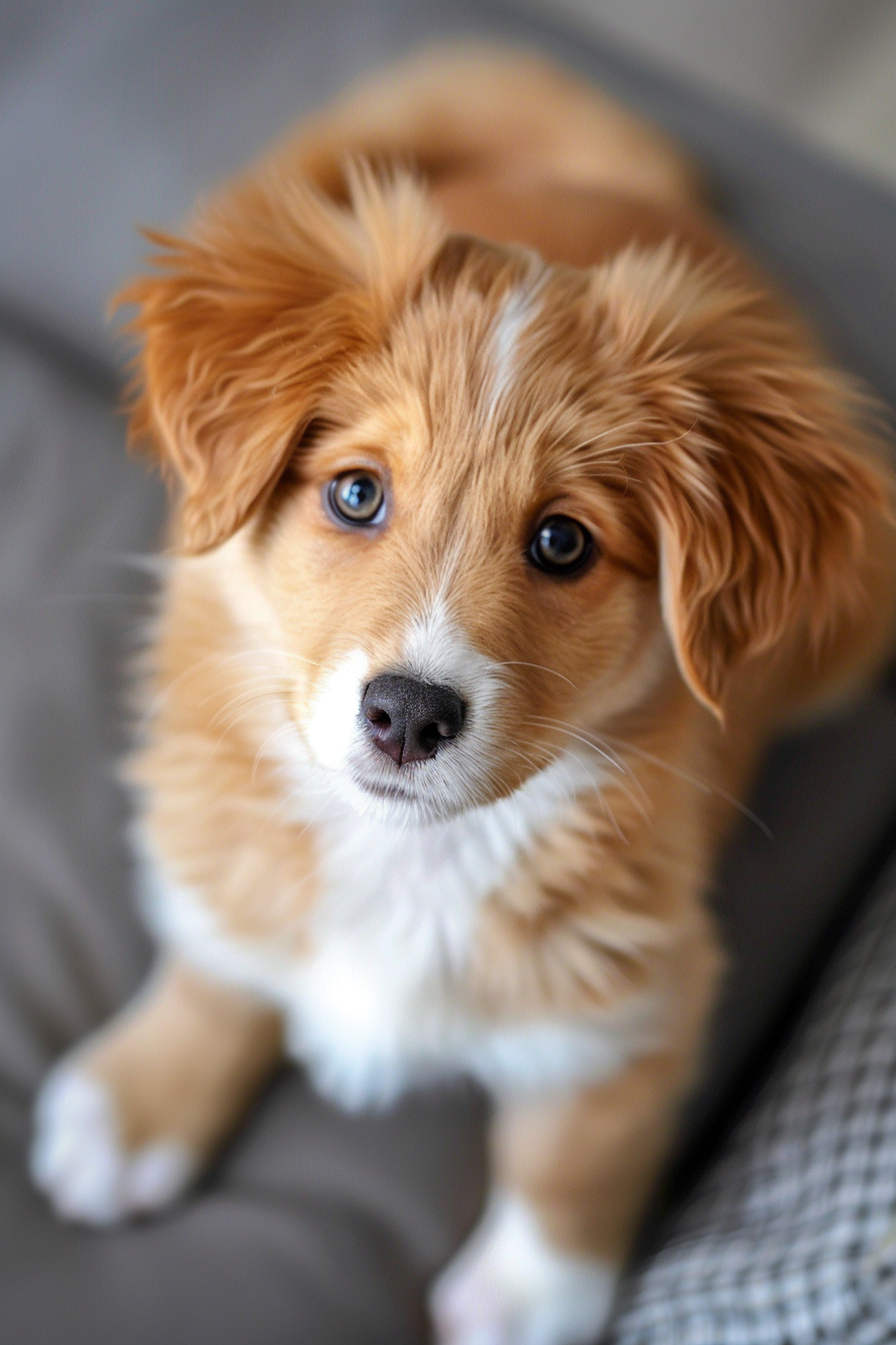 Adorable golden-brown puppy with blue eyes and fluffy fur, looking up with curiosity. Perfect for pet lovers and animal enthusiasts.