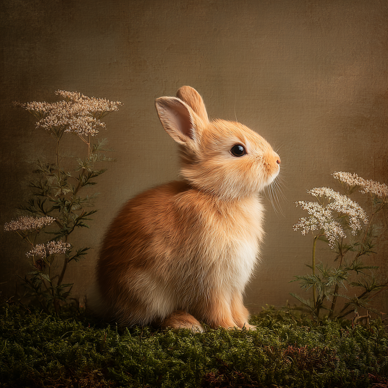 A cute light brown rabbit sits on moss, surrounded by white flowers, in a softly lit, earthy-toned setting.