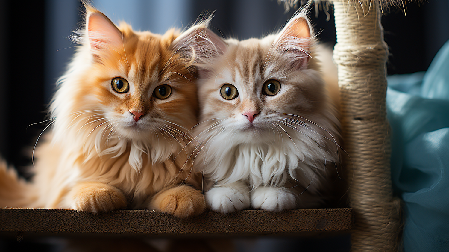 Two fluffy cats with orange and cream coats sit together on a cat tree, showcasing their striking amber eyes and soft fur.