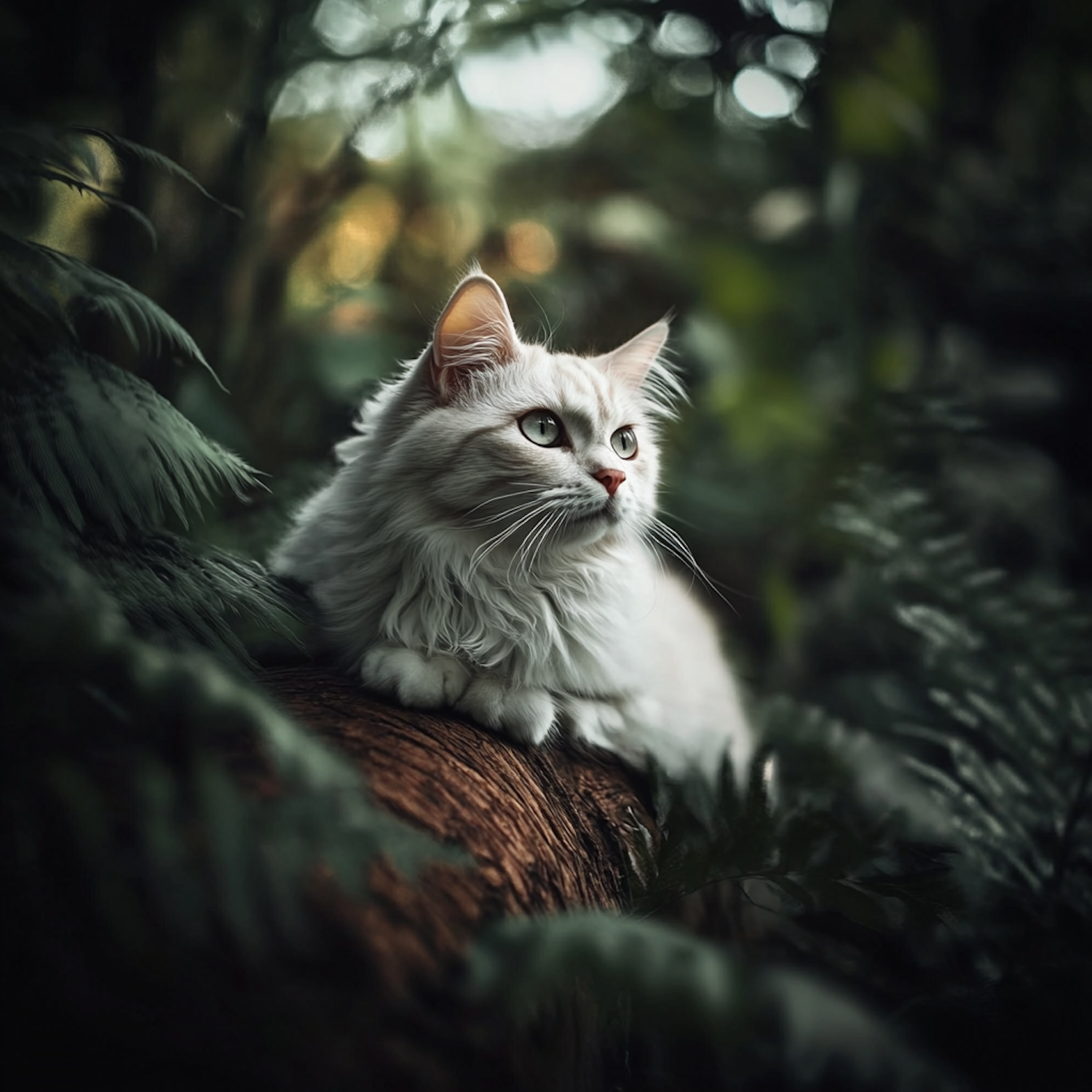 A fluffy white cat with green eyes sits on a log amidst lush greenery, exuding elegance and tranquility in a serene forest setting.