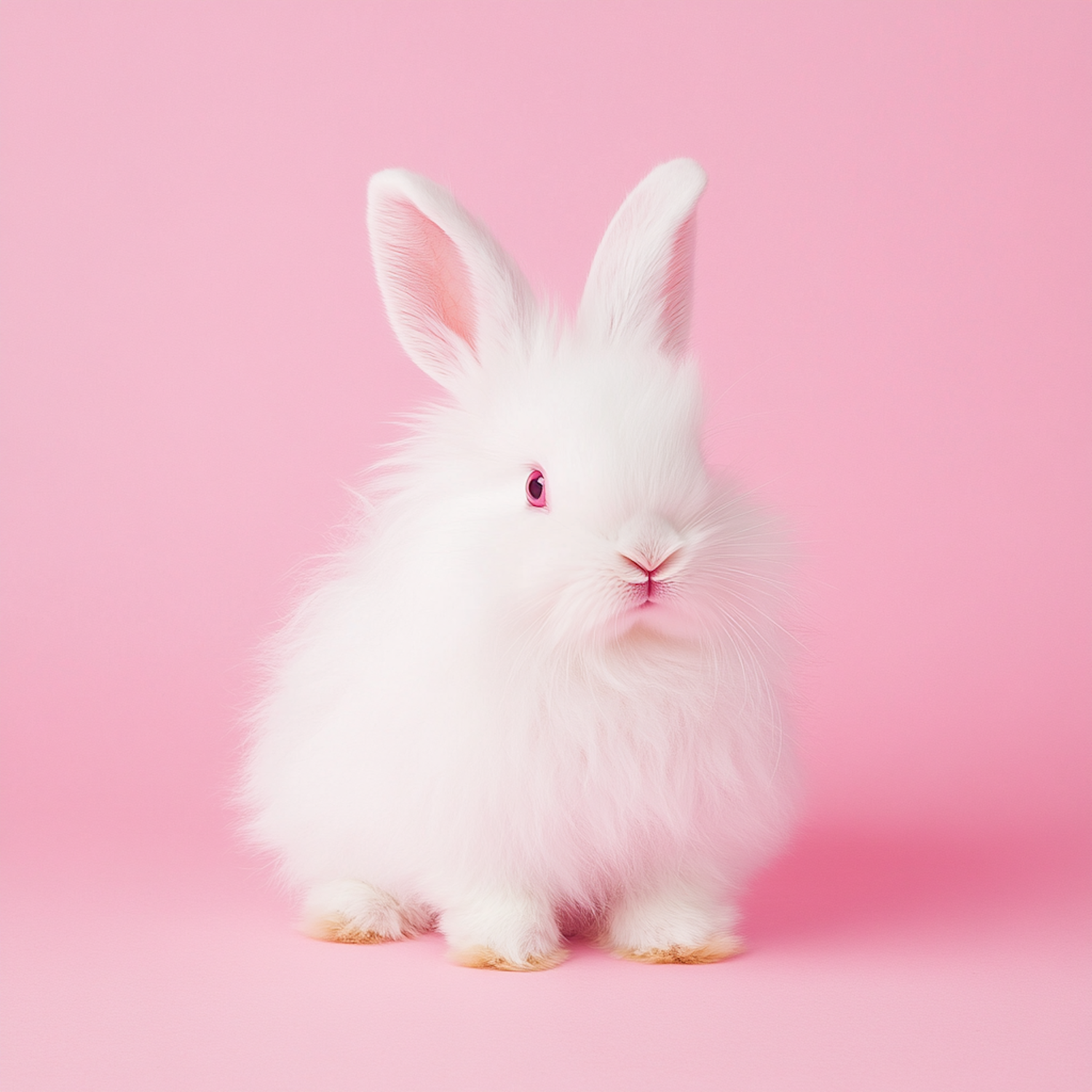 Adorable fluffy white rabbit with pink eyes on a pastel pink background, creating a charming and gentle scene.