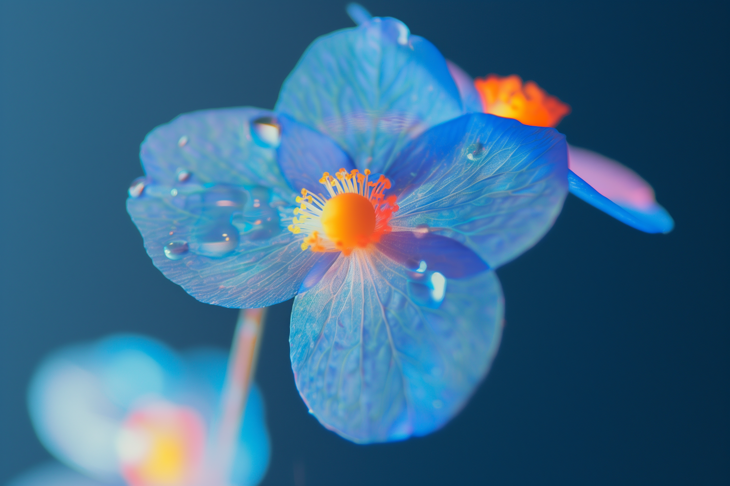 Close-up of a vibrant blue flower with water droplets and an orange center, set against a soft blue background.