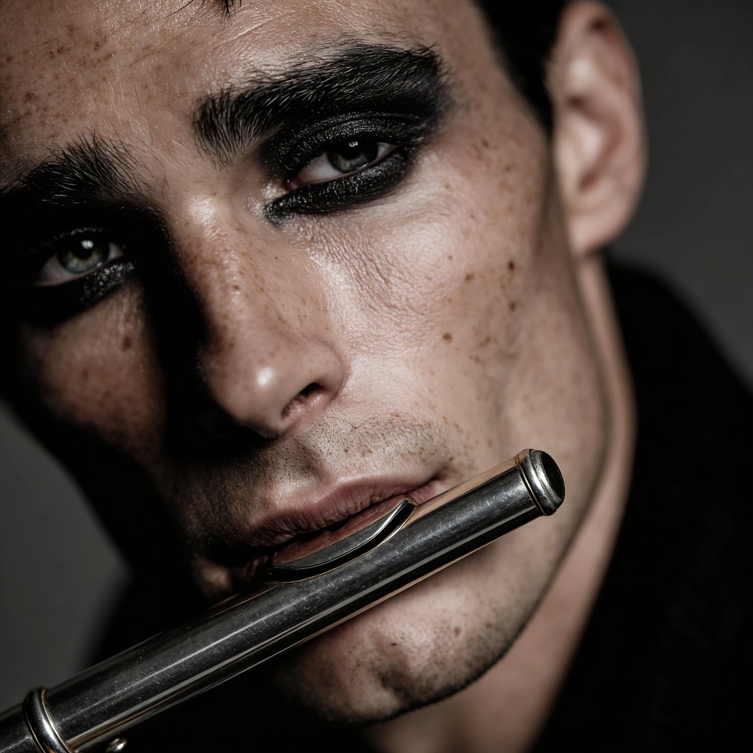 Close-up of a person with dramatic makeup holding a metallic flute, showcasing intense expression and artistic lighting.