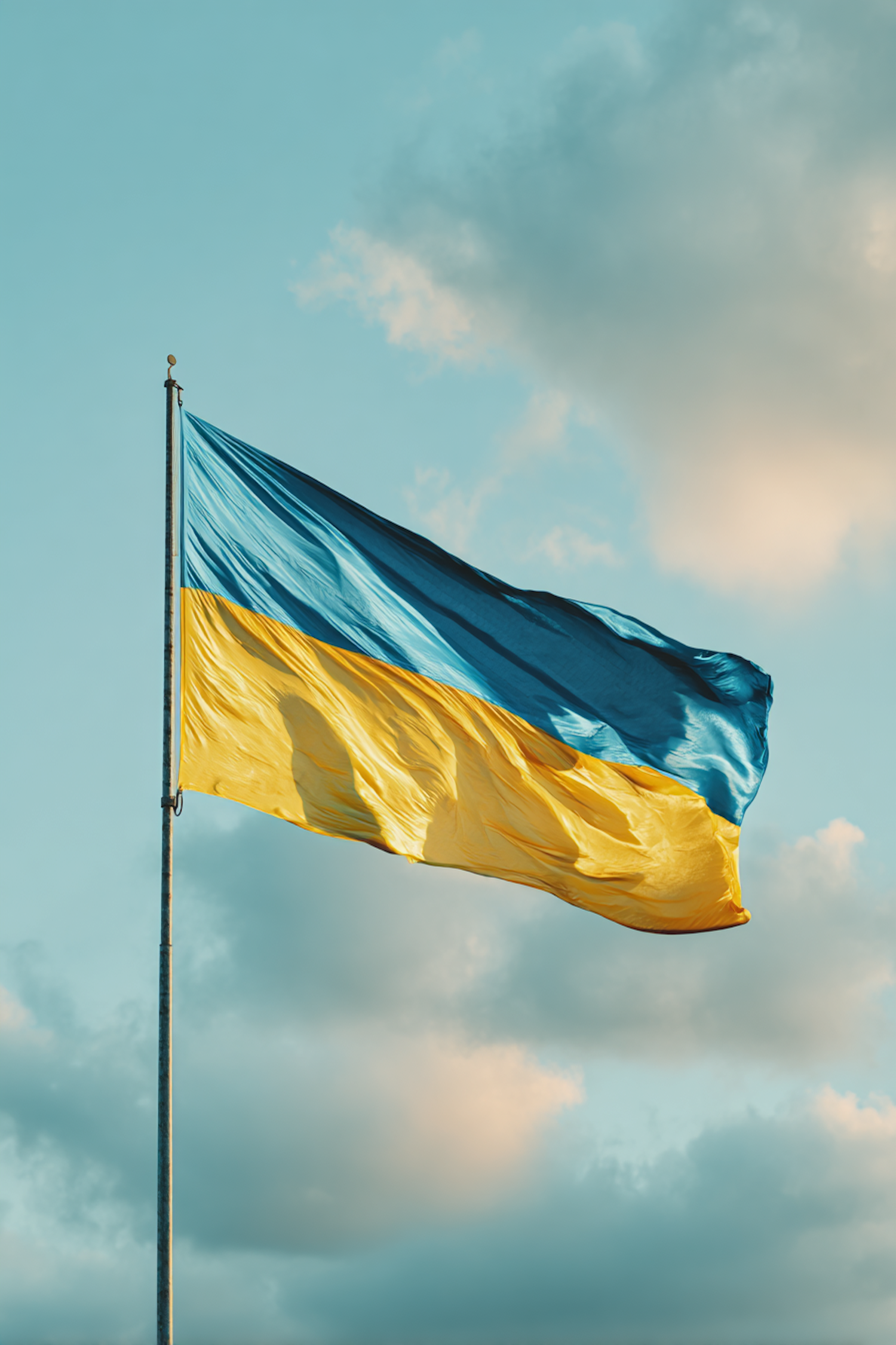 A vibrant Ukrainian flag waves in the sky with blue and yellow tones standing out beautifully against scattered clouds.
