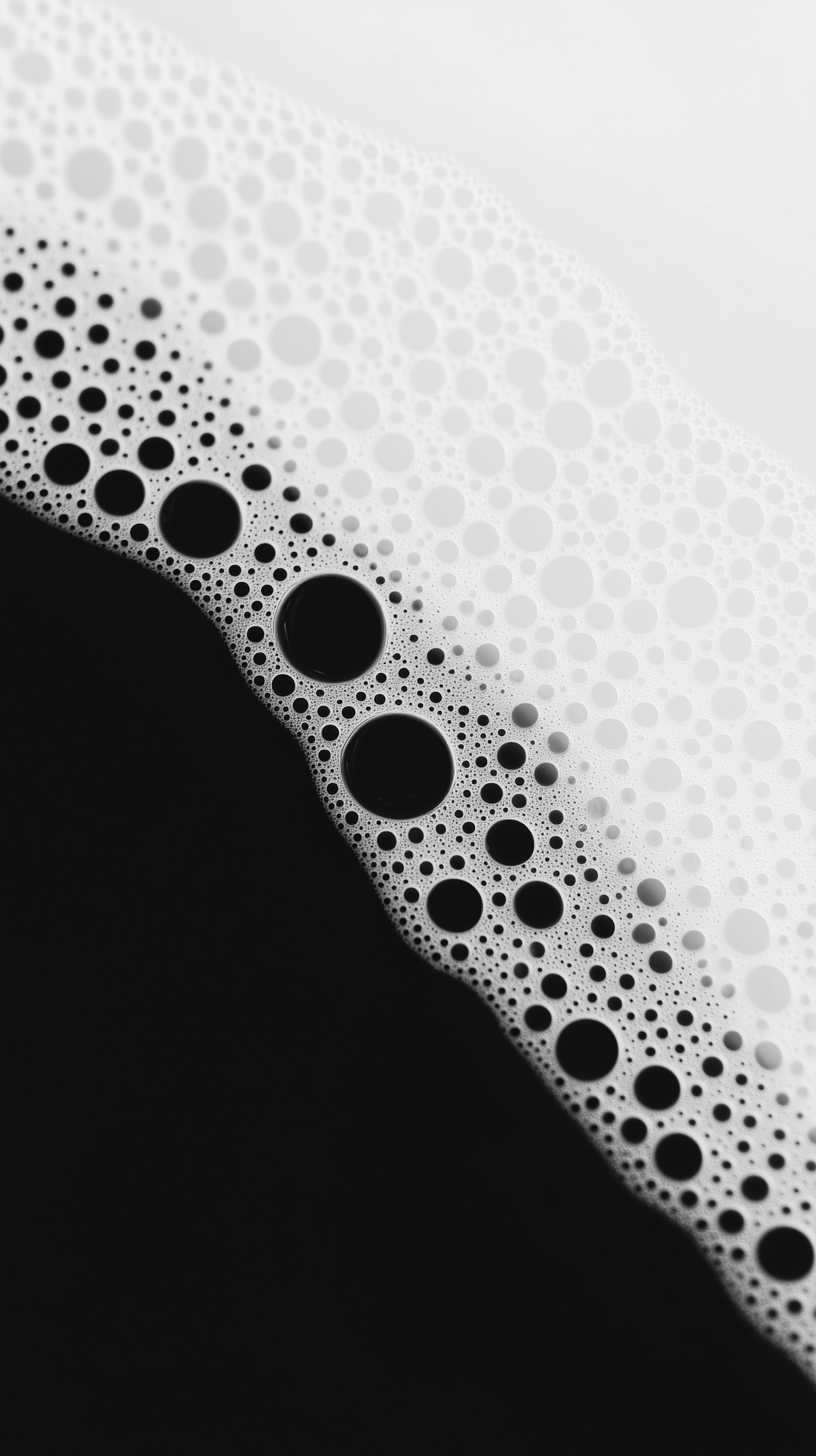 Close-up of soap bubbles with a striking black and white contrast, showcasing intricate textures and circular patterns.