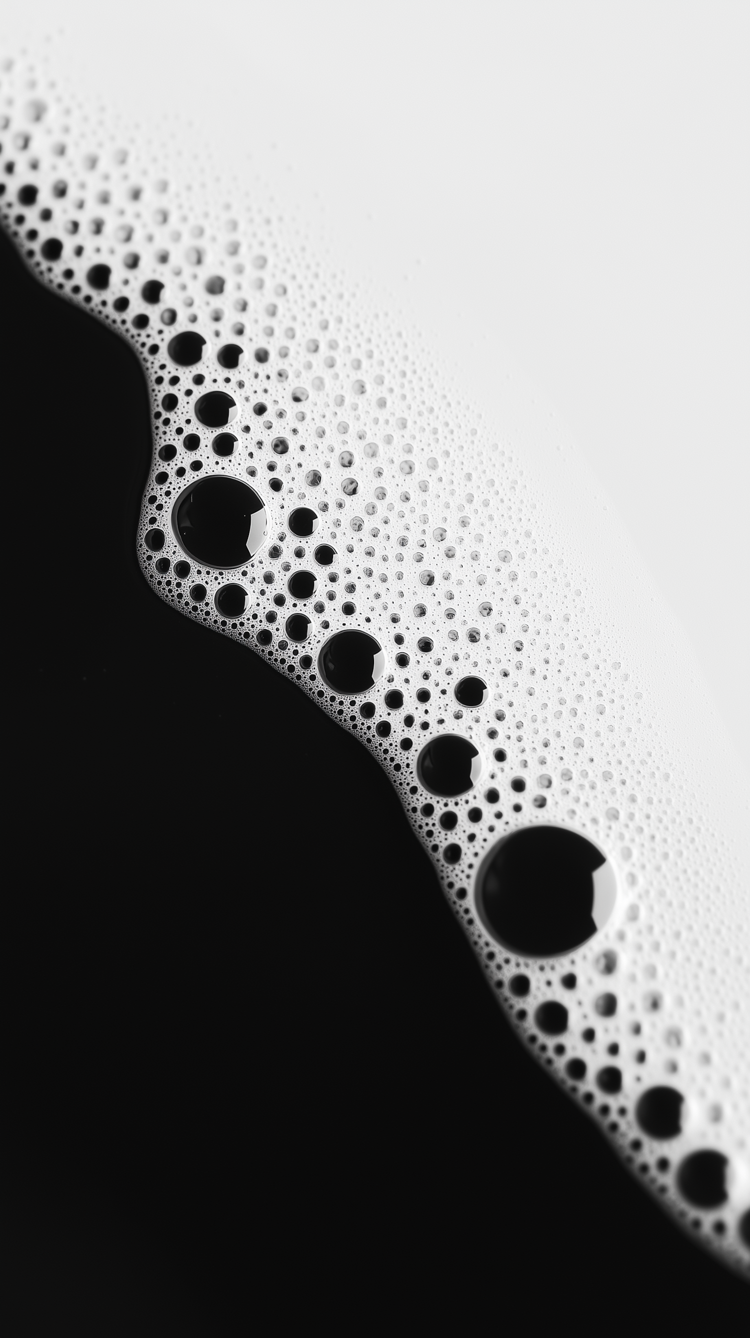Close-up of white foam bubbles on a black background, creating a striking contrast with intricate textures and reflective details.