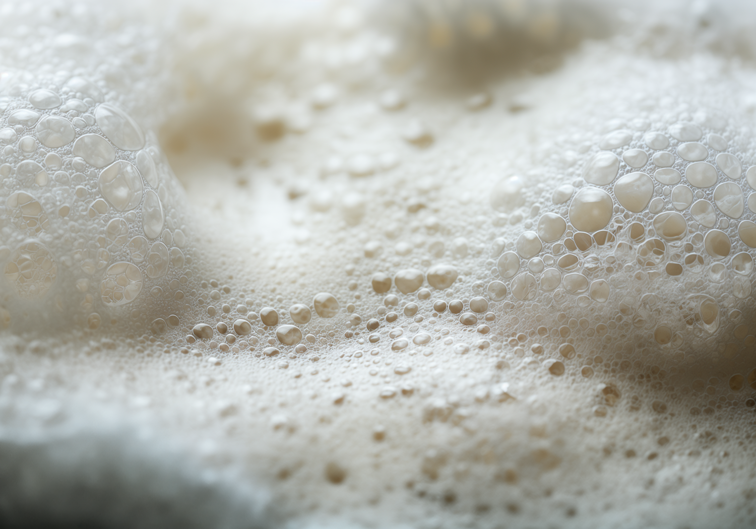Close-up of frothy bubbles with a soft white and cream color palette, showcasing intricate textures and patterns in an abstract composition.