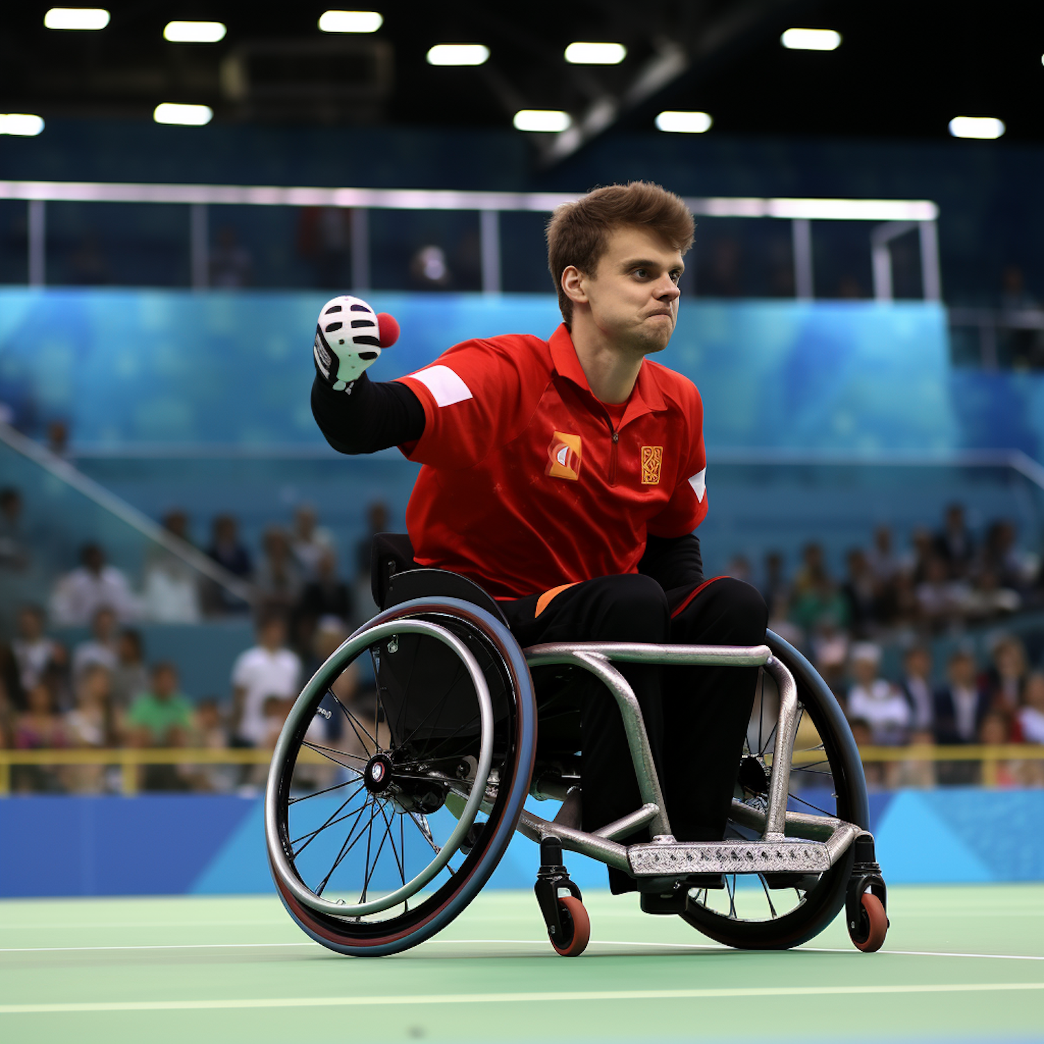 Young male wheelchair athlete in action, wearing a red jersey, holding a red ball, with a focused expression in an indoor sports arena.