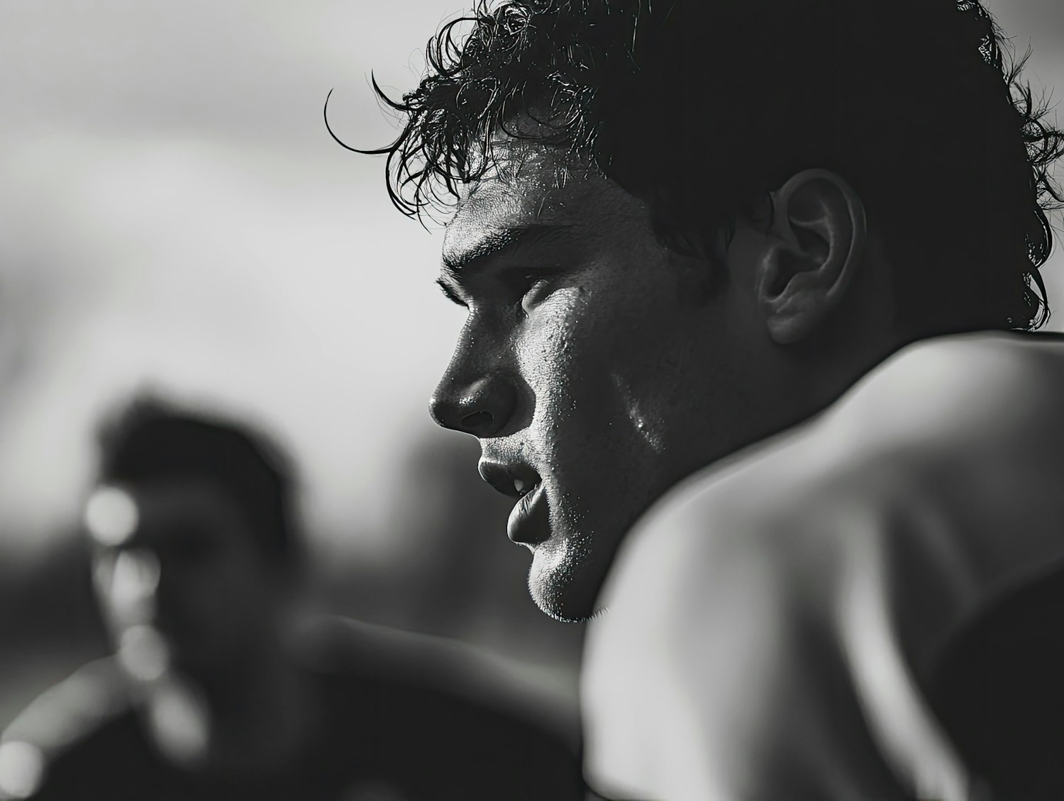 Black-and-white close-up of a young man with damp hair and a focused expression, set against a blurred background with another figure.
