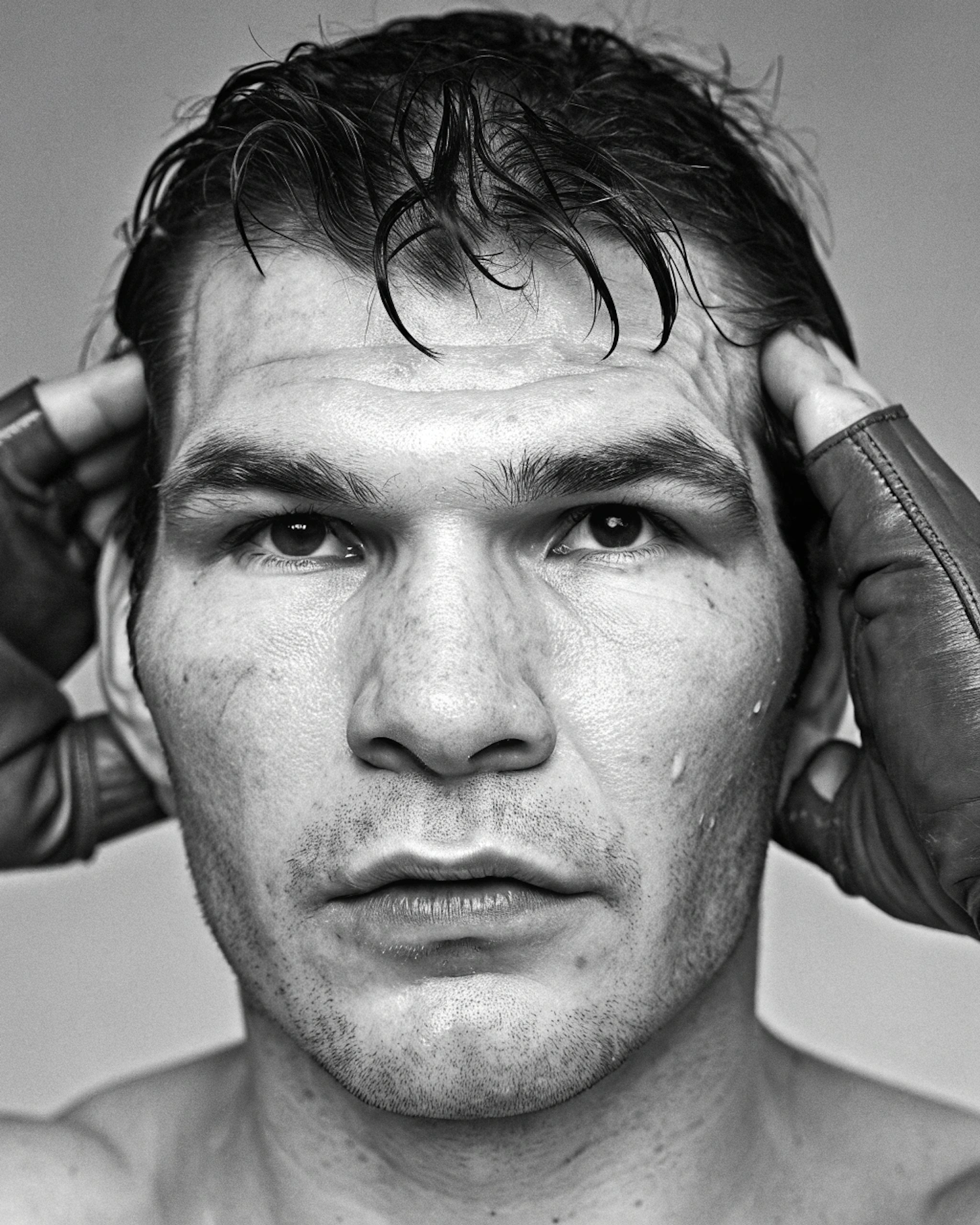 Black-and-white close-up of a man with wet hair and gloves, exuding focus and intensity, possibly an athlete or fighter.