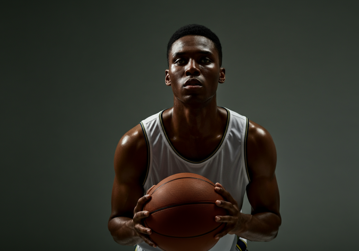 Focused basketball player holding a ball, wearing a white jersey with black and yellow trim, set against a dramatic dark gray background.