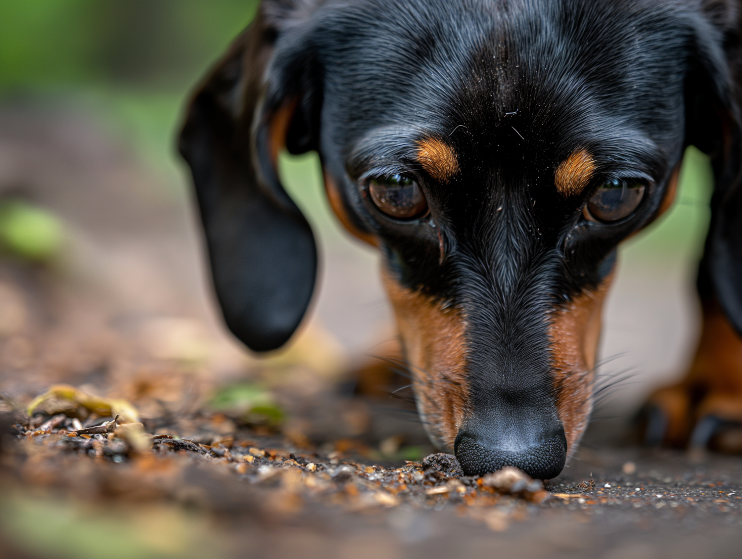 Close-up of a dachshund with black and tan fur sniffing the ground, showcasing its expressive eyes and curious nature.
