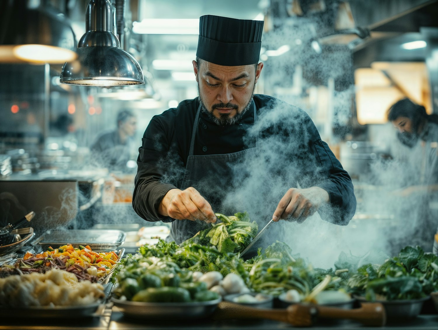 Asian chef in a busy kitchen, focused on preparing fresh vegetables amidst steam and vibrant colors.