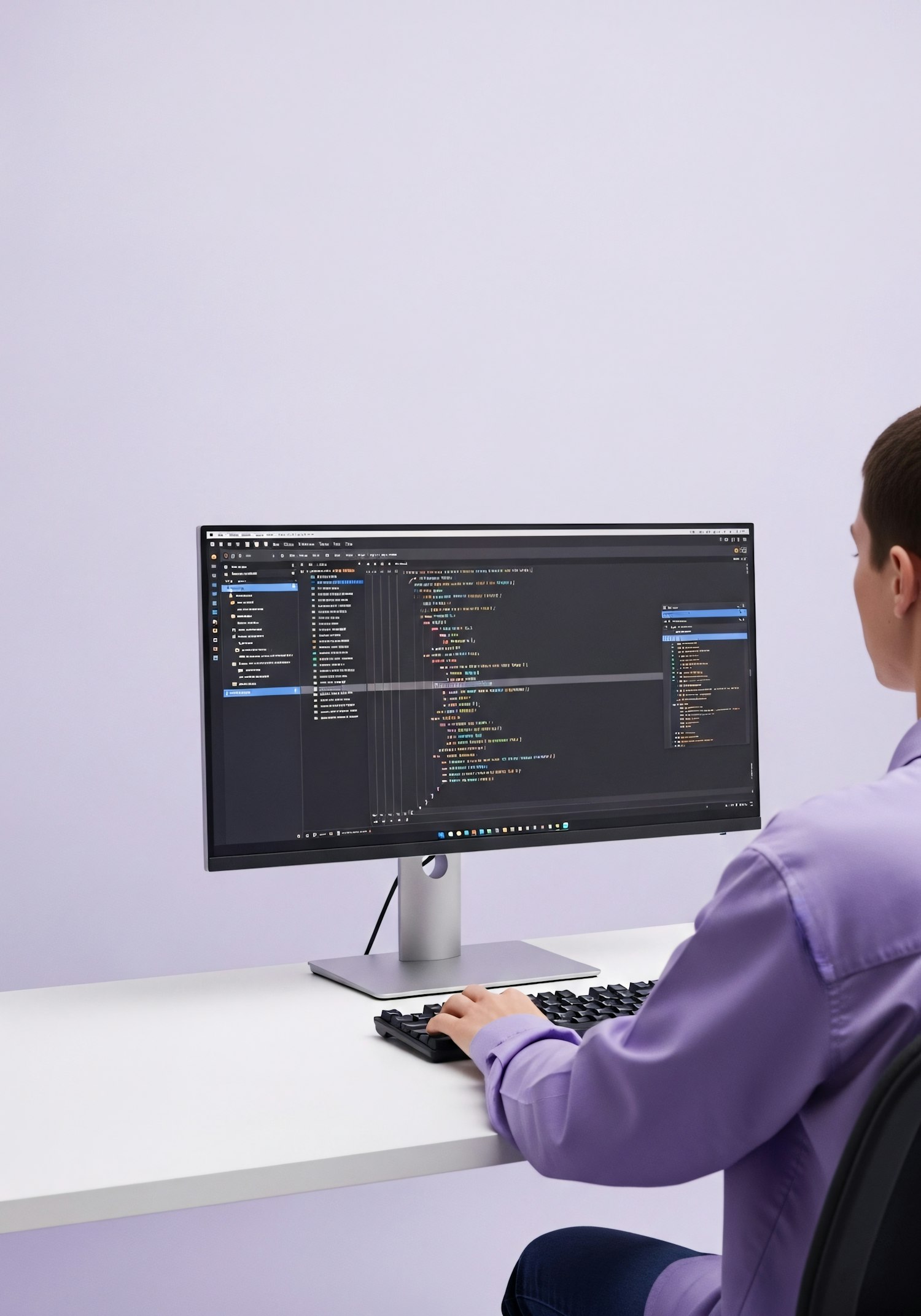 A person in a purple shirt works on coding at a clean desk setup with a large monitor displaying a code editor.