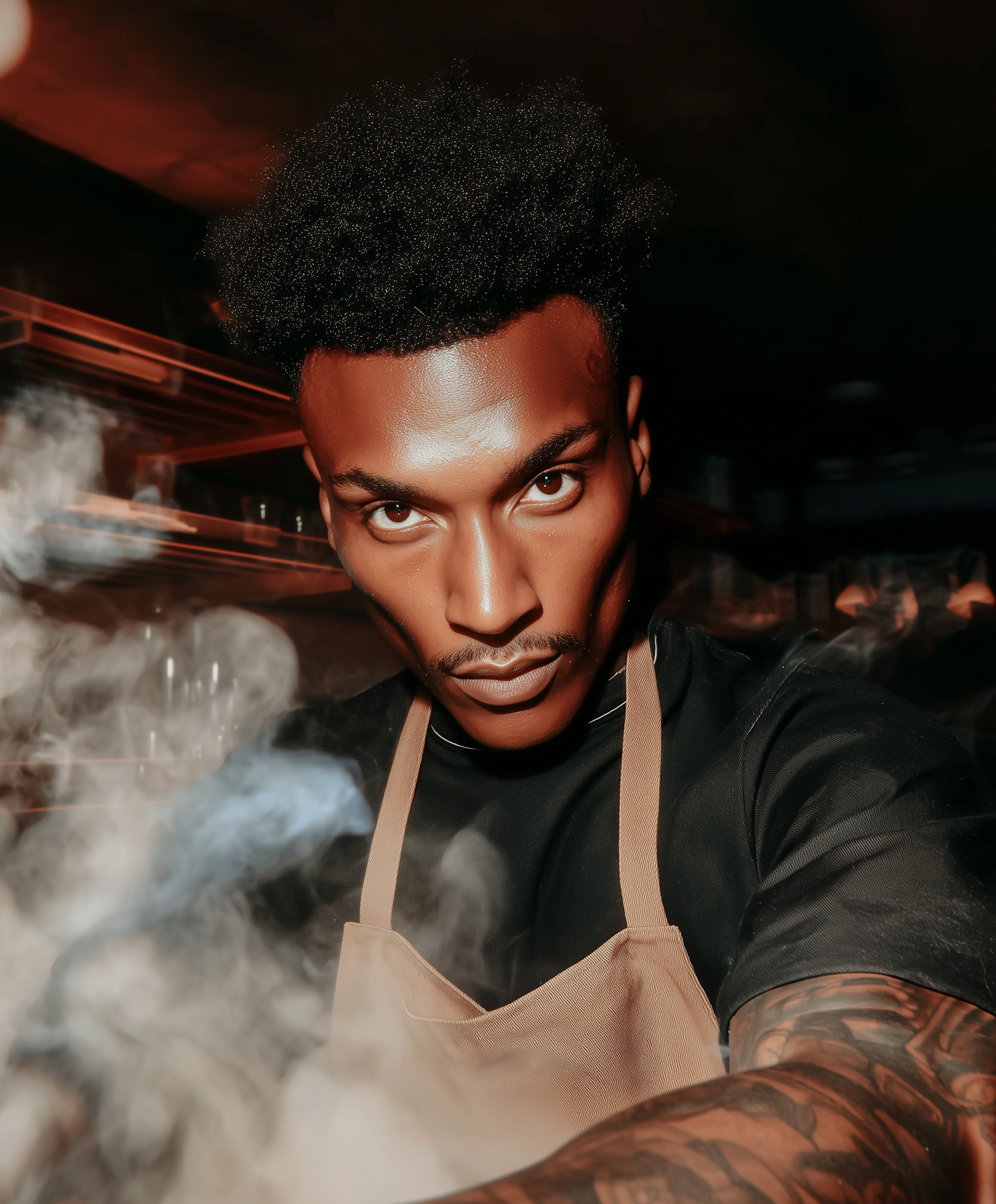 Dynamic portrait of a person cooking, with detailed tattoos, amidst stylish lighting and a smoky culinary setting.