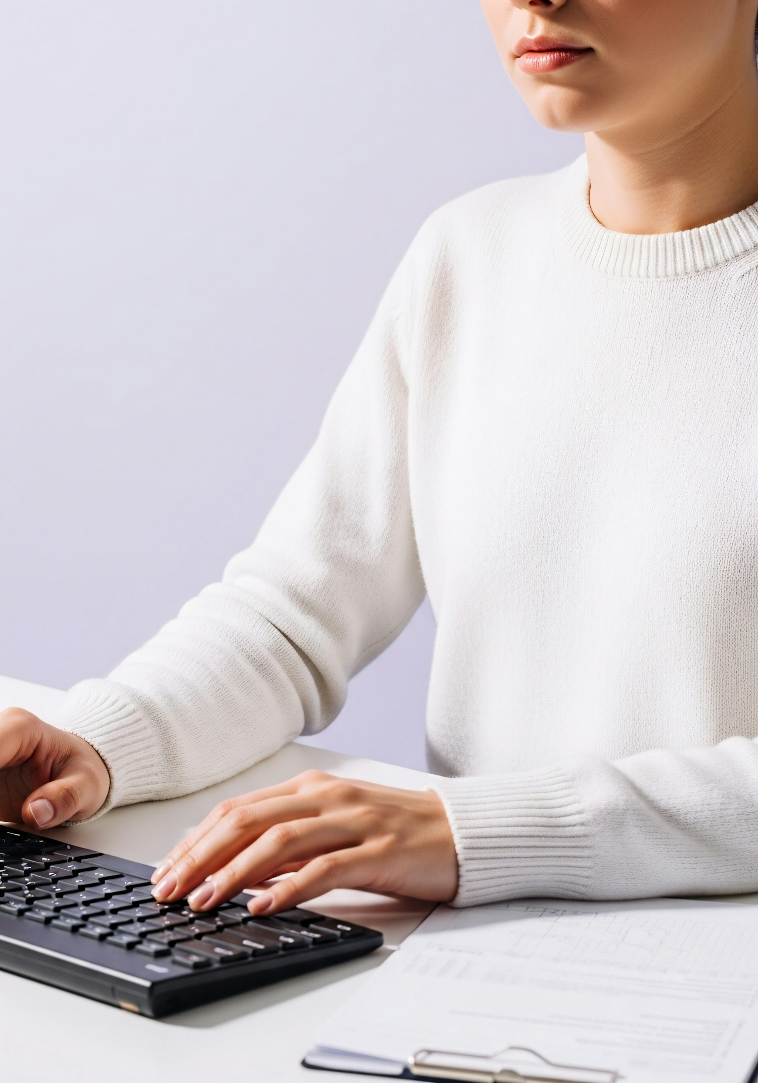 A person in a white sweater typing on a black keyboard at a desk with a clipboard, suggesting a professional or organized setting.